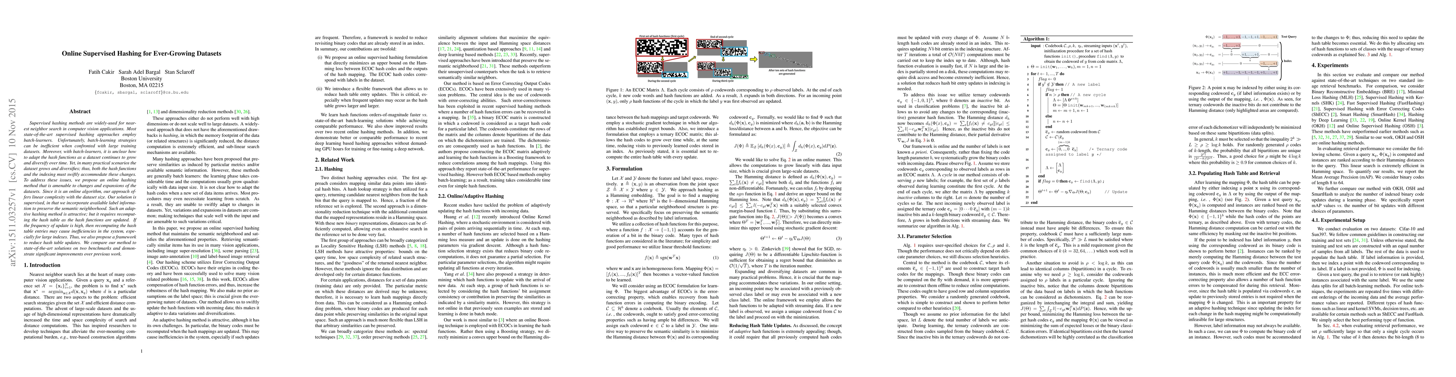 This paper proposes an online supervised hashing method for efficiently handling ever-growing datasets in computer vision applications, addressing the inefficiencies of batch-learning strategies. The method adapts to dataset changes with linear complexity and incorporates label information to maintain semantic neighborhood, while also introducing a framework to minimize hash table updates.