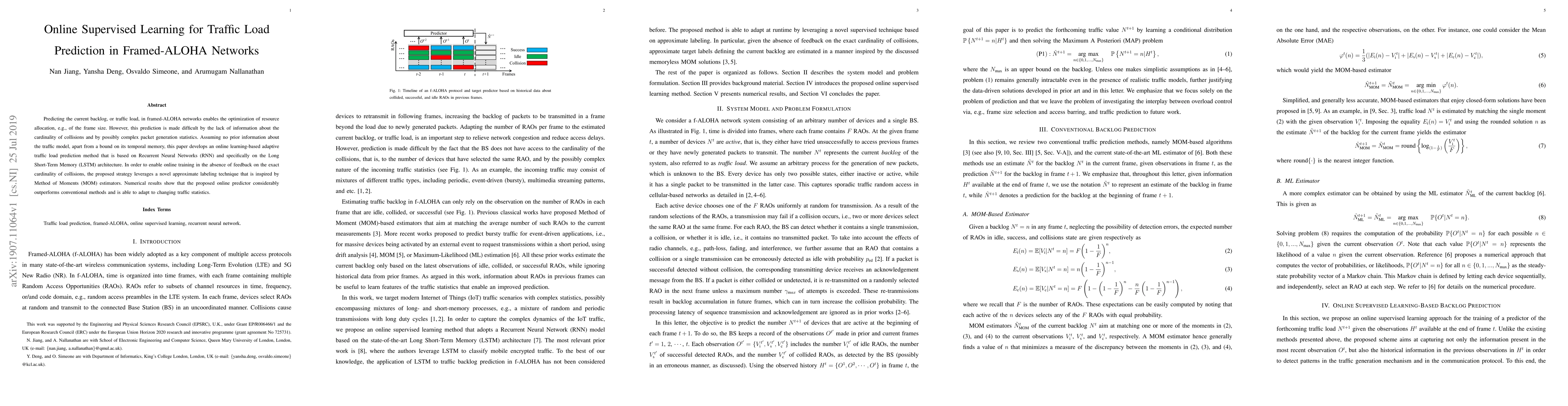 This paper proposes an online supervised learning method using Long Short-Term Memory (LSTM) networks for predicting traffic load in framed-ALOHA networks, addressing challenges due to lack of collision information. It employs an innovative approximate labeling technique inspired by Method of Moments estimators for training, demonstrating superior performance over traditional methods.
