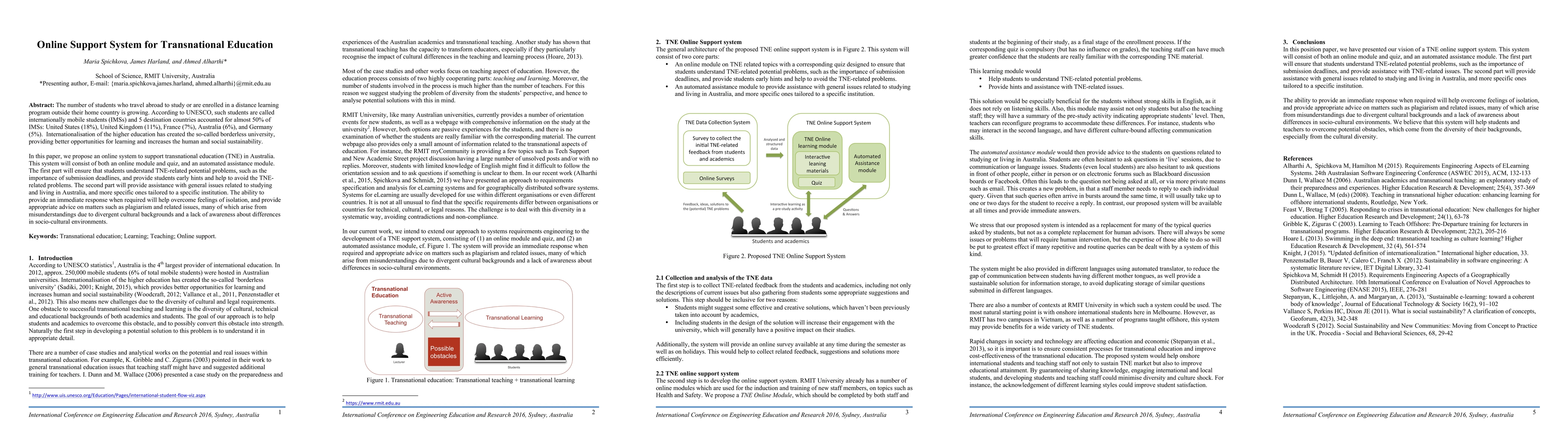 The number of students who travel abroad to study or are enrolled in a distance learning program outside their home country is growing. According to UNESCO, such students are called internationally mobile students (IMSs) and 5 destination countries accounted for almost 50% of IMSs: United States (18%), United Kingdom (11%), France (7%), Australia (6%), and Germany (5%). Internationalisation of the higher education has created the so-called borderless university, providing better opportunities for learning and increases the human and social sustainability. In this paper, we propose an online system to support transnational education (TNE) in Australia. This system will consist of both an online module and quiz, and an automated assistance module. The first part will ensure that students understand TNE-related potential problems, such as the importance of submission deadlines, and provide students early hints and help to avoid the TNE-related problems. The second part will provide assistance with general issues related to studying and living in Australia, and more specific ones tailored to a specific institution. The ability to provide an immediate response when required will help overcome feelings of isolation, and provide appropriate advice on matters such as plagiarism and related issues, many of which arise from misunderstandings due to divergent cultural backgrounds and a lack of awareness about differences in socio-cultural environments.