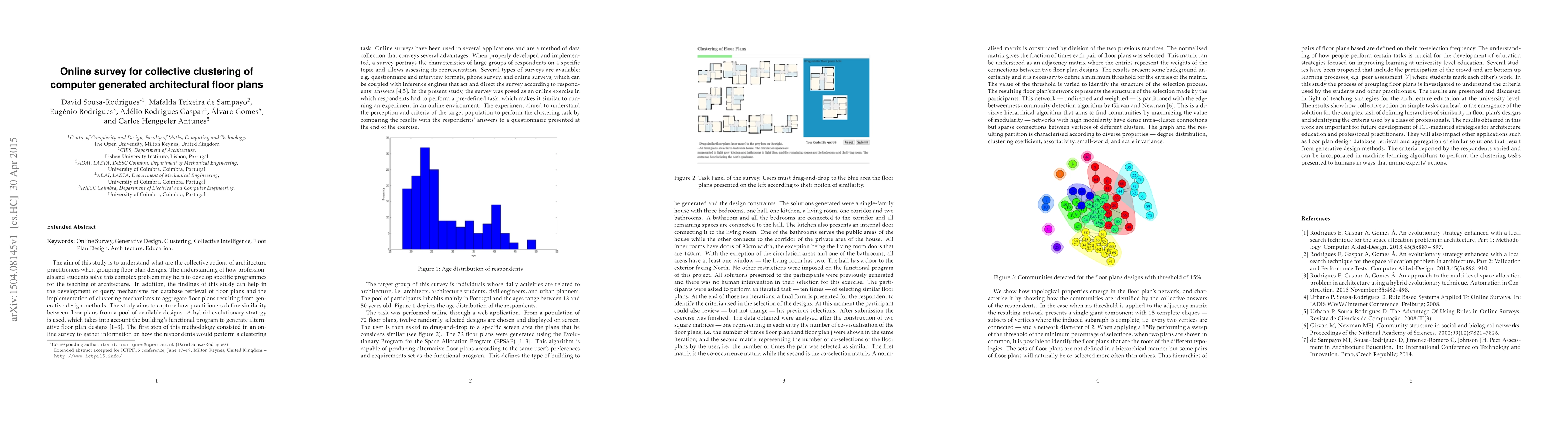 The aim of this study is to understand what are the collective actions of architecture practitioners when grouping floor plan designs. The understanding of how professionals and students solve this complex problem may help to develop specific programmes for the teaching of architecture. In addition, the findings of this study can help in the development of query mechanisms for database retrieval of floor plans and the implementation of clustering mechanisms to aggregate floor plans resulting from generative design methods. The study aims to capture how practitioners define similarity between floor plans from a pool of available designs. A hybrid evolutionary strategy is used, which takes into account the building's functional program to generate alternative floor plan designs. The first step of this methodology consisted in an online survey to gather information on how the respondents would perform a clustering task. Online surveys have been used in several applications and are a method of data collection that conveys several advantages. When properly developed and implemented, a survey portrays the characteristics of large groups of respondents on a specific topic and allows assessing its representation. Several types of surveys are available; e.g. questionnaire and interview formats, phone survey, and online surveys, which can be coupled with inference engines that act and direct the survey according to respondents' answers. In the present study, the survey was posed as an online exercise in which respondents had to perform a pre-defined task, which makes it similar to running an experiment in an online environment. The experiment aimed to understand the perception and criteria of the target population to perform the clustering task by comparing the results with the respondents' answers to a questionnaire presented at the end of the exercise.