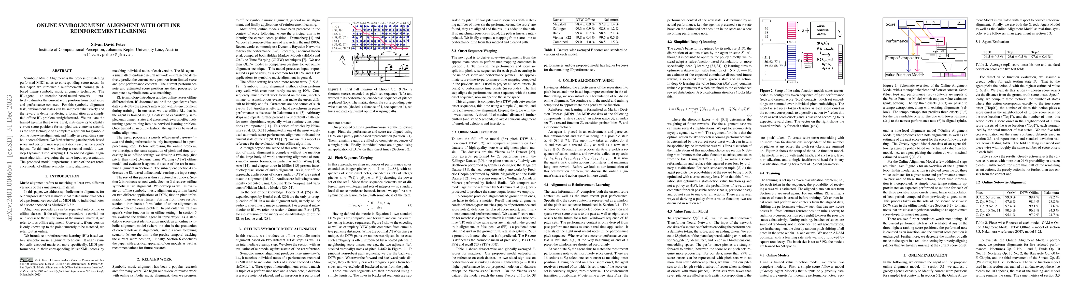 Symbolic Music Alignment is the process of matching performed MIDI notes to corresponding score notes. In this paper, we introduce a reinforcement learning (RL)-based online symbolic music alignment technique. The RL agent - an attention-based neural network - iteratively estimates the current score position from local score and performance contexts. For this symbolic alignment task, environment states can be sampled exhaustively and the reward is dense, rendering a formulation as a simplified offline RL problem straightforward. We evaluate the trained agent in three ways. First, in its capacity to identify correct score positions for sampled test contexts; second, as the core technique of a complete algorithm for symbolic online note-wise alignment; and finally, as a real-time symbolic score follower. We further investigate the pitch-based score and performance representations used as the agent's inputs. To this end, we develop a second model, a two-step Dynamic Time Warping (DTW)-based offline alignment algorithm leveraging the same input representation. The proposed model outperforms a state-of-the-art reference model of offline symbolic music alignment.