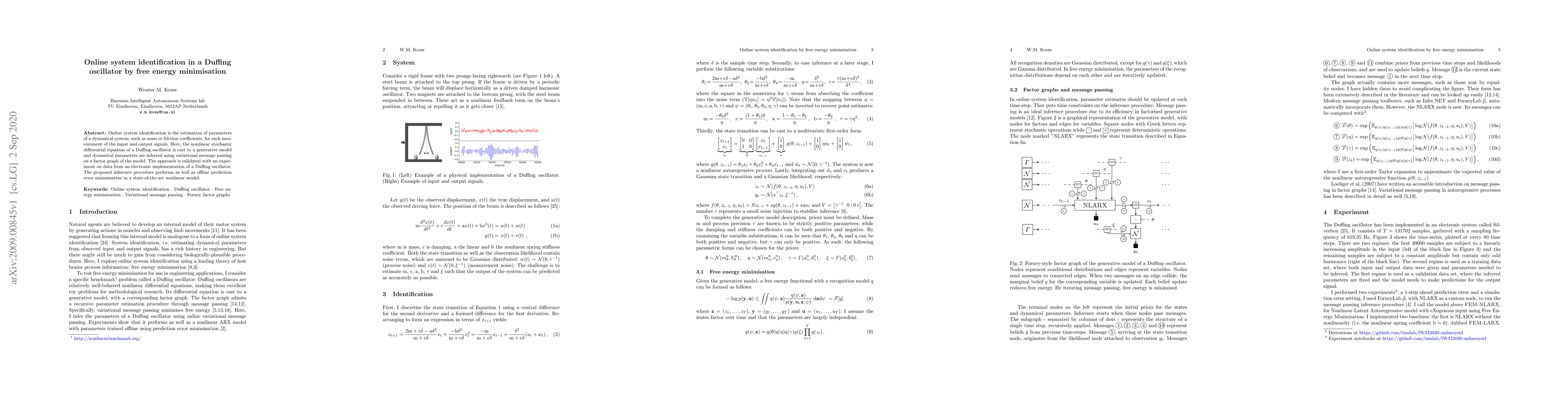 Online system identification is the estimation of parameters of a dynamical system, such as mass or friction coefficients, for each measurement of the input and output signals. Here, the nonlinear stochastic differential equation of a Duffing oscillator is cast to a generative model and dynamical parameters are inferred using variational message passing on a factor graph of the model. The approach is validated with an experiment on data from an electronic implementation of a Duffing oscillator. The proposed inference procedure performs as well as offline prediction error minimisation in a state-of-the-art nonlinear model.