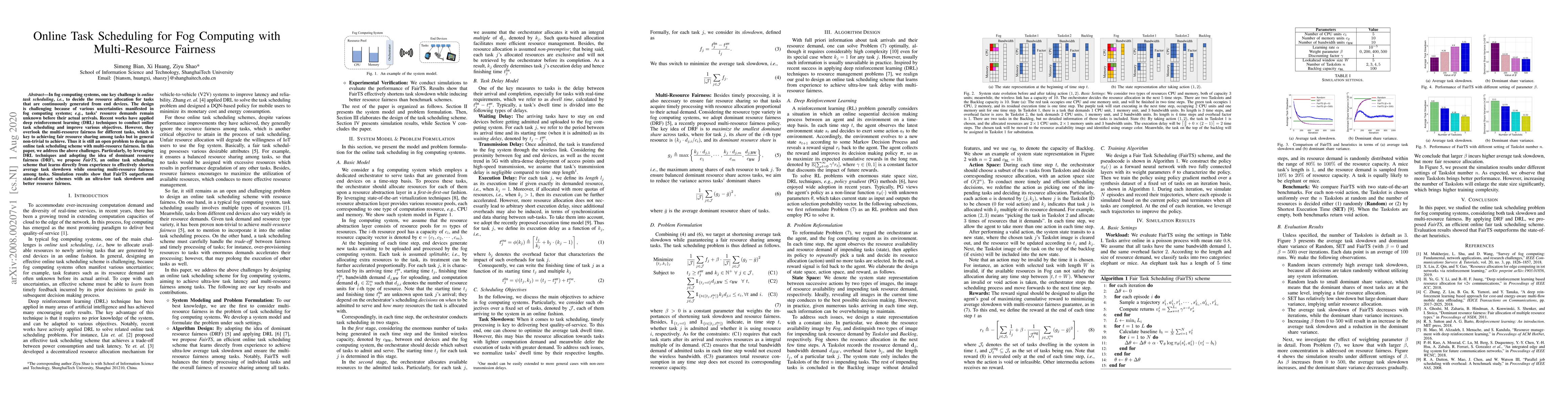 This paper proposes FairTS, an online task scheduling scheme for fog computing that uses deep reinforcement learning and dominant resource fairness to minimize task slowdown while ensuring multi-resource fairness among tasks. Simulation results demonstrate that FairTS outperforms existing methods in both efficiency and fairness.
