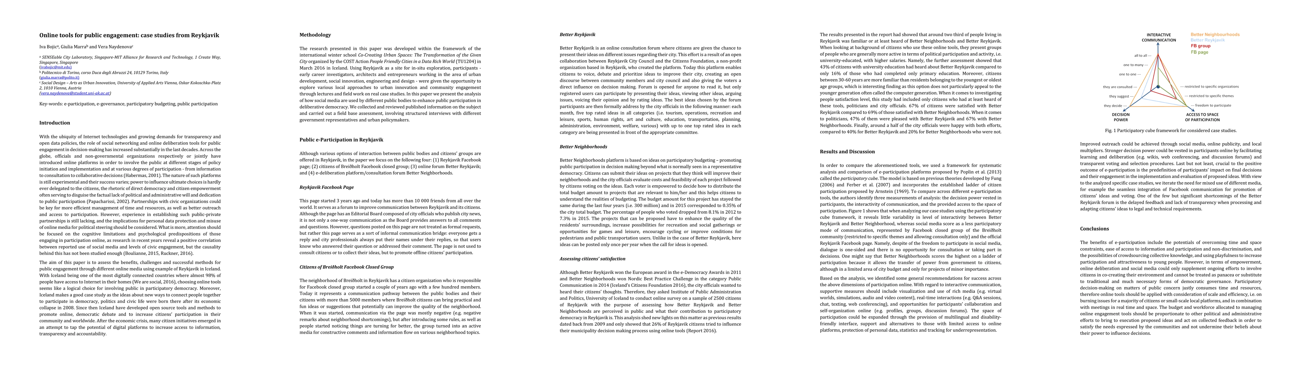 This paper examines the use of social networking and online deliberation tools for public engagement in Reykjavik, analyzing how they enhance public participation in decision-making. Findings suggest that online tools should be applied judiciously based on scale and efficiency, and should complement real-time meetings, while budget and workforce allocation should match the political and administrative efforts to act on community feedback.