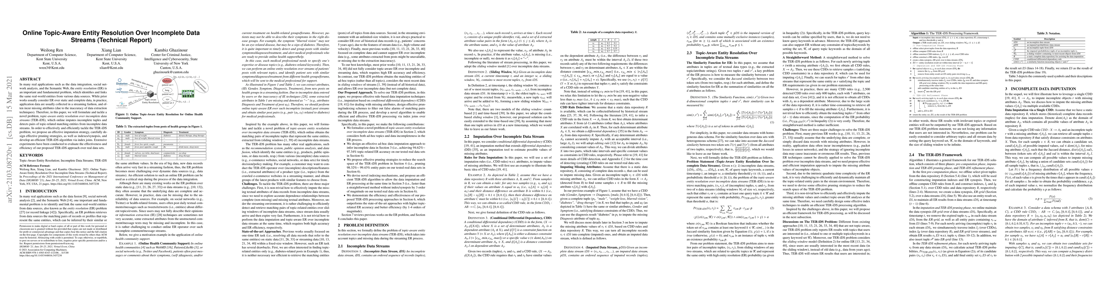 This paper addresses topic-aware entity resolution over incomplete data streams, proposing an online imputation strategy and efficient algorithms to handle missing attributes in streaming data. Extensive experiments demonstrate the effectiveness and efficiency of the proposed TER-iDS approach.