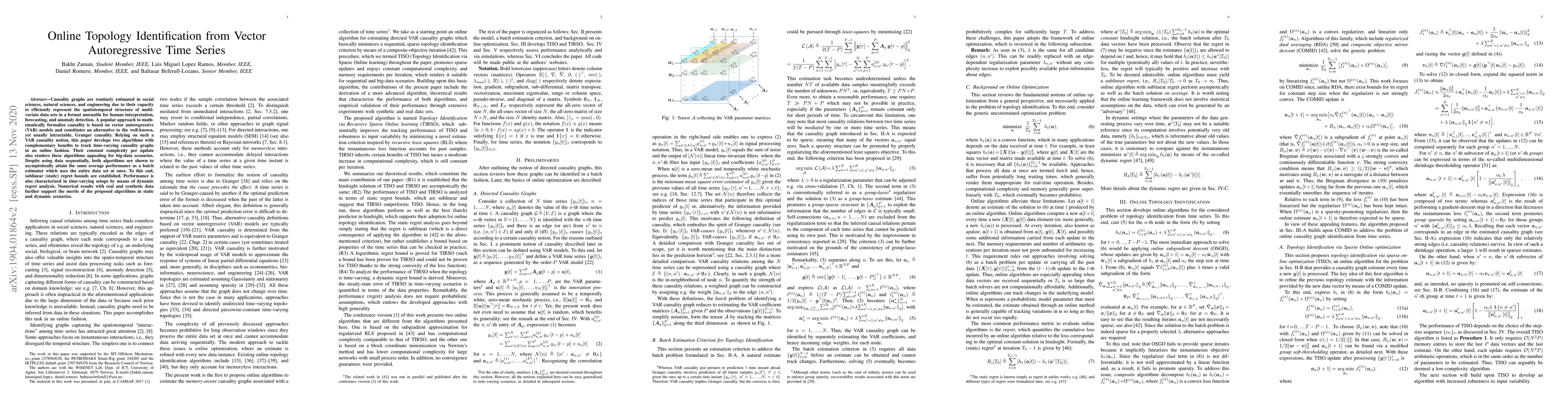 This paper proposes two algorithms for online topology identification in vector autoregressive time series to track dynamic causality graphs with constant complexity per update. The algorithms achieve comparable performance to batch estimators in static and dynamic scenarios.