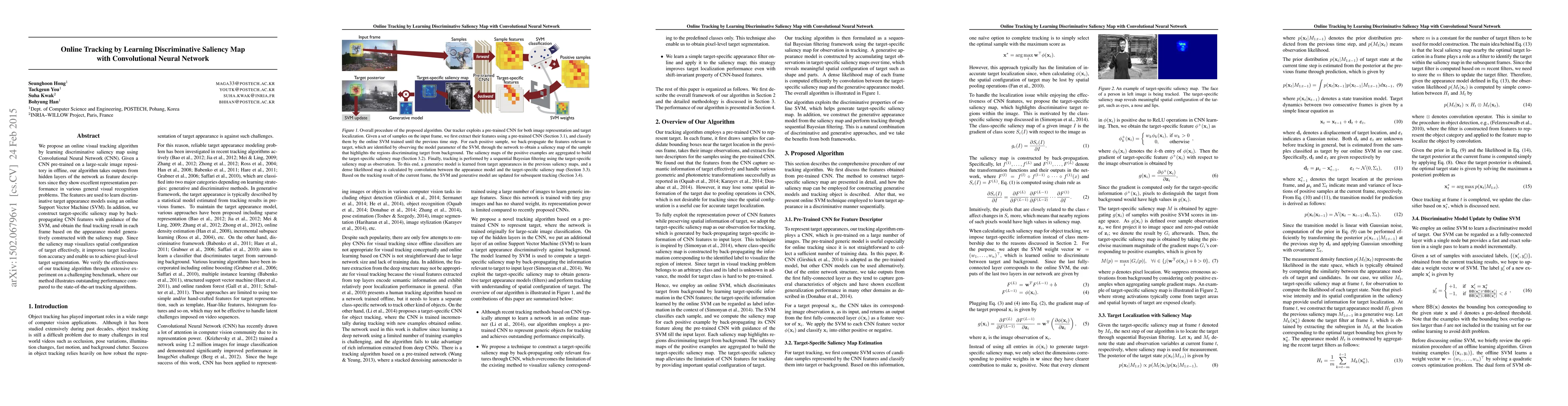 This paper proposes an online visual tracking algorithm that uses a Convolutional Neural Network (CNN) to learn discriminative saliency maps, enhancing target localization accuracy and enabling pixel-level segmentation. The method employs CNN features and an online Support Vector Machine (SVM) to construct a target-specific saliency map, achieving superior performance on a benchmark dataset.
