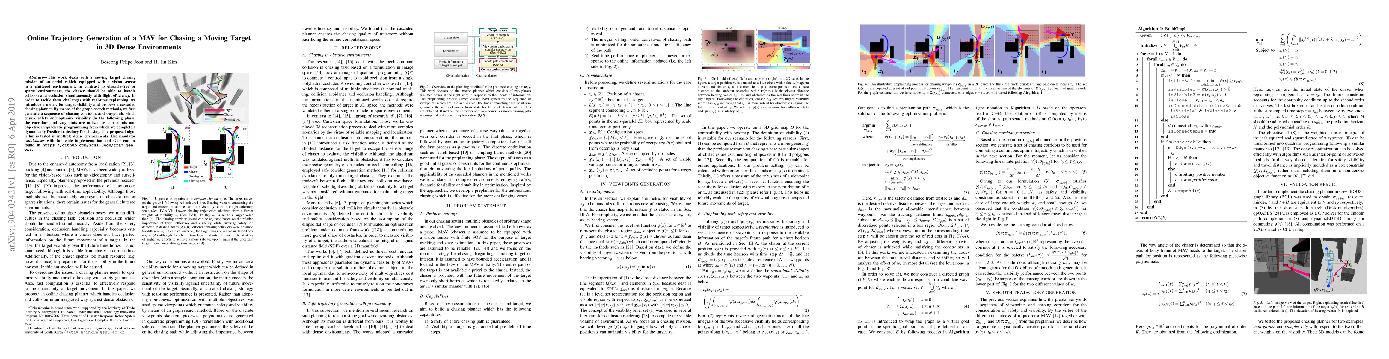 This work deals with a moving target chasing mission of an aerial vehicle equipped with a vision sensor in a cluttered environment. In contrast to obstacle-free or sparse environments, the chaser should be able to handle collision and occlusion simultaneously with flight efficiency. In order to tackle these challenges with real-time replanning, we introduce a metric for target visibility and propose a cascaded chasing planner. By means of the graph-search methods, we first generate a sequence of chasing corridors and waypoints which ensure safety and optimize visibility. In the following phase, the corridors and waypoints are utilized as constraints and objective in quadratic programming from which we complete a dynamically feasible trajectory for chasing. The proposed algorithm is tested in multiple dense environments. The simulator AutoChaser with full code implementation and GUI can be found in https://github.com/icsl-Jeon/traj_gen_vis