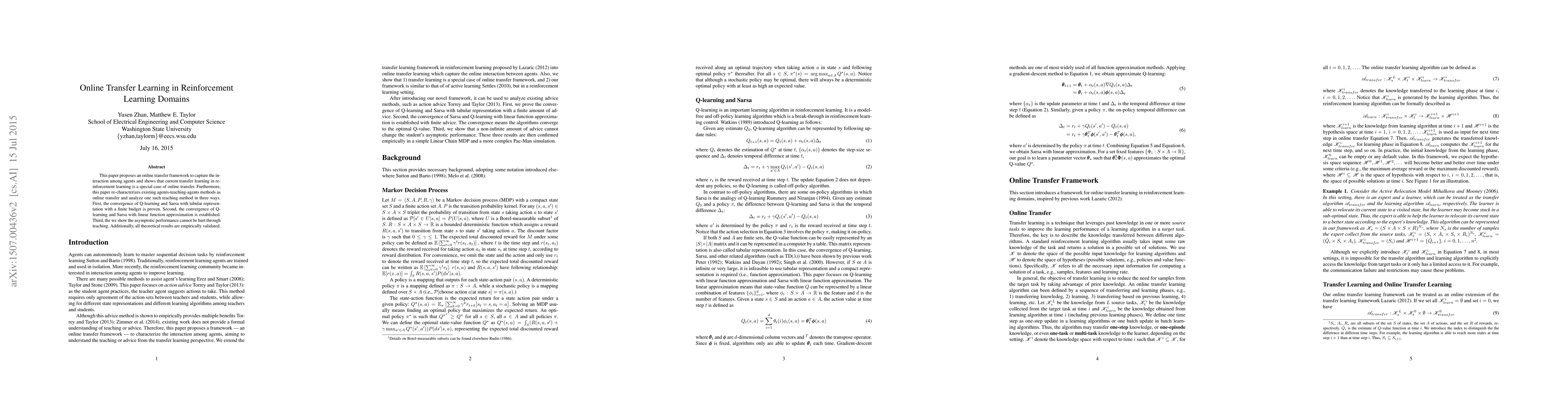 This paper proposes an online transfer framework to capture the interaction among agents and shows that current transfer learning in reinforcement learning is a special case of online transfer. Furthermore, this paper re-characterizes existing agents-teaching-agents methods as online transfer and analyze one such teaching method in three ways. First, the convergence of Q-learning and Sarsa with tabular representation with a finite budget is proven. Second, the convergence of Q-learning and Sarsa with linear function approximation is established. Third, the we show the asymptotic performance cannot be hurt through teaching. Additionally, all theoretical results are empirically validated.