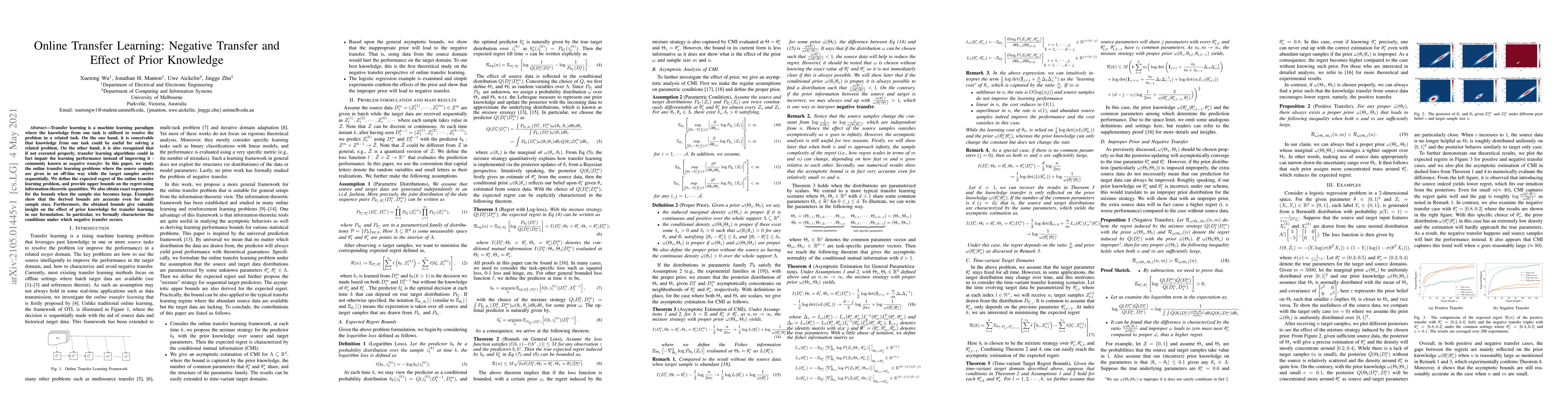 This paper studies online transfer learning, exploring how knowledge from one task can improve or impair performance in a related task. It provides bounds on regret using information-theoretic quantities and characterizes conditions for negative transfer.