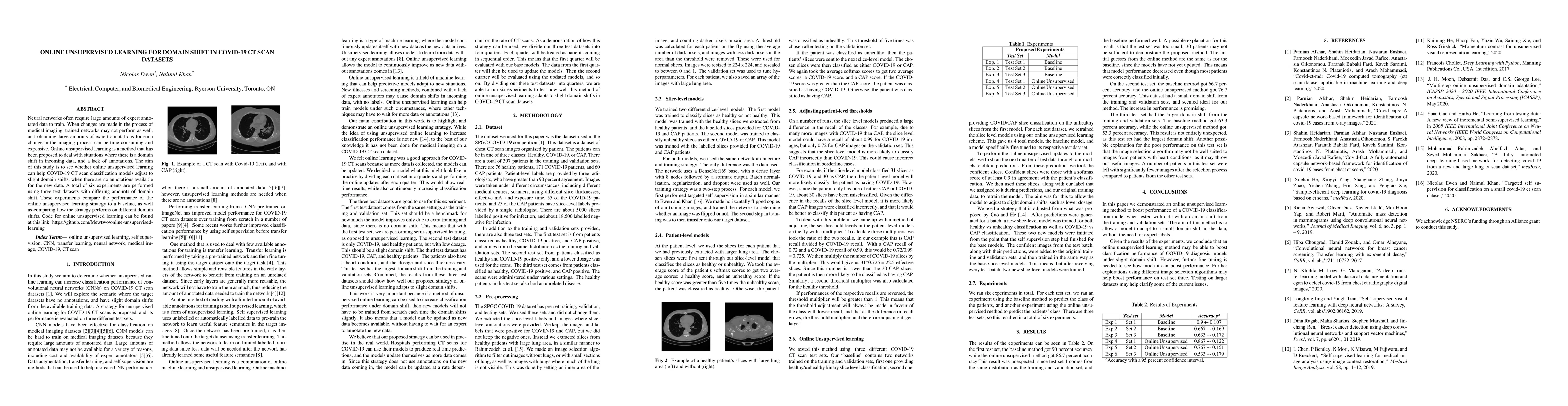 Neural networks often require large amounts of expert annotated data to train. When changes are made in the process of medical imaging, trained networks may not perform as well, and obtaining large amounts of expert annotations for each change in the imaging process can be time consuming and expensive. Online unsupervised learning is a method that has been proposed to deal with situations where there is a domain shift in incoming data, and a lack of annotations. The aim of this study is to see whether online unsupervised learning can help COVID-19 CT scan classification models adjust to slight domain shifts, when there are no annotations available for the new data. A total of six experiments are performed using three test datasets with differing amounts of domain shift. These experiments compare the performance of the online unsupervised learning strategy to a baseline, as well as comparing how the strategy performs on different domain shifts. Code for online unsupervised learning can be found at this link: https://github.com/Mewtwo/online-unsupervised-learning