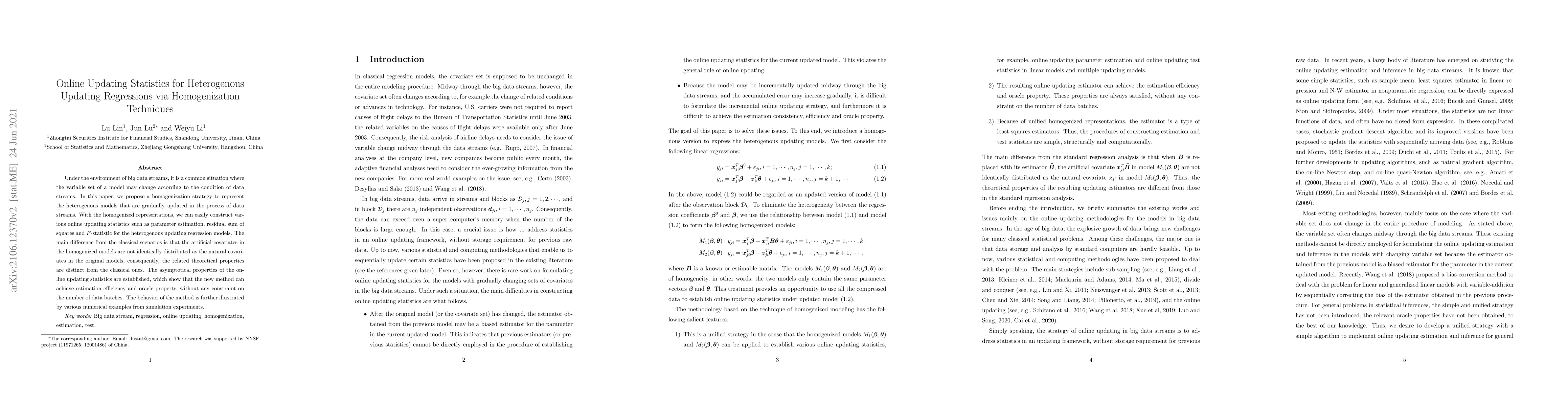 Under the environment of big data streams, it is a common situation where the variable set of a model may change according to the condition of data streams. In this paper, we propose a homogenization strategy to represent the heterogenous models that are gradually updated in the process of data streams. With the homogenized representations, we can easily construct various online updating statistics such as parameter estimation, residual sum of squares and $F$-statistic for the heterogenous updating regression models. The main difference from the classical scenarios is that the artificial covariates in the homogenized models are not identically distributed as the natural covariates in the original models, consequently, the related theoretical properties are distinct from the classical ones. The asymptotical properties of the online updating statistics are established, which show that the new method can achieve estimation efficiency and oracle property, without any constraint on the number of data batches. The behavior of the method is further illustrated by various numerical examples from simulation experiments.
