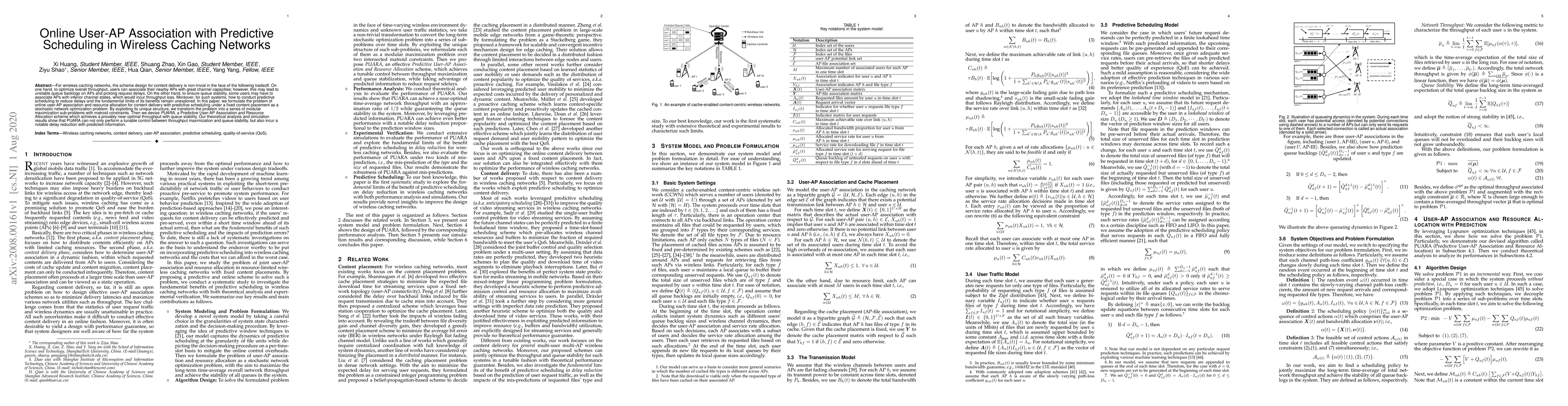 This paper proposes PUARA, a scheme for online user-AP association and resource allocation in wireless caching networks, balancing throughput and queue stability through predictive scheduling. The authors demonstrate that PUARA can achieve near-optimal throughput while maintaining queue stability and reducing delays.