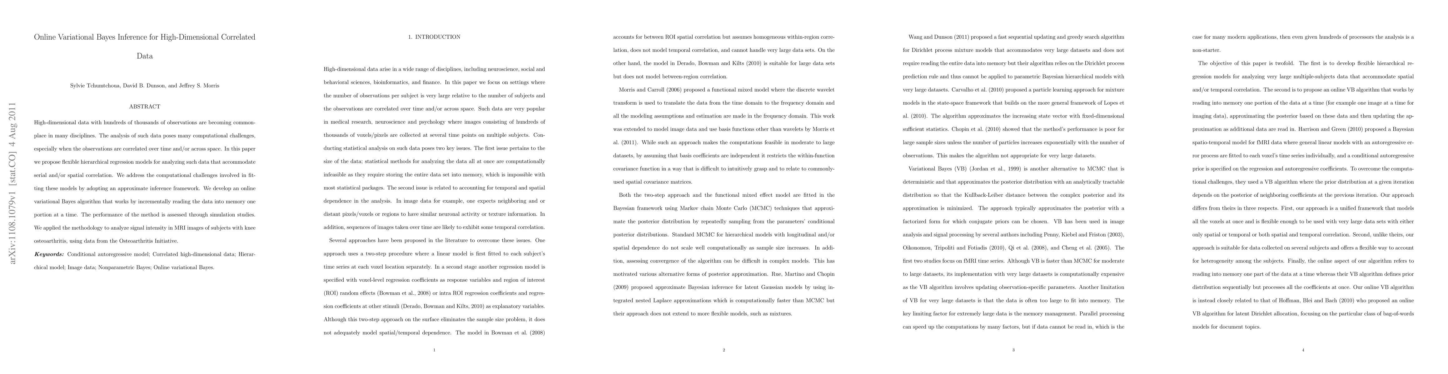 This paper proposes flexible hierarchical regression models for analyzing high-dimensional, correlated data, employing an online variational Bayes algorithm to address computational challenges. The method is demonstrated through simulations and applied to MRI images of knee osteoarthritis patients.