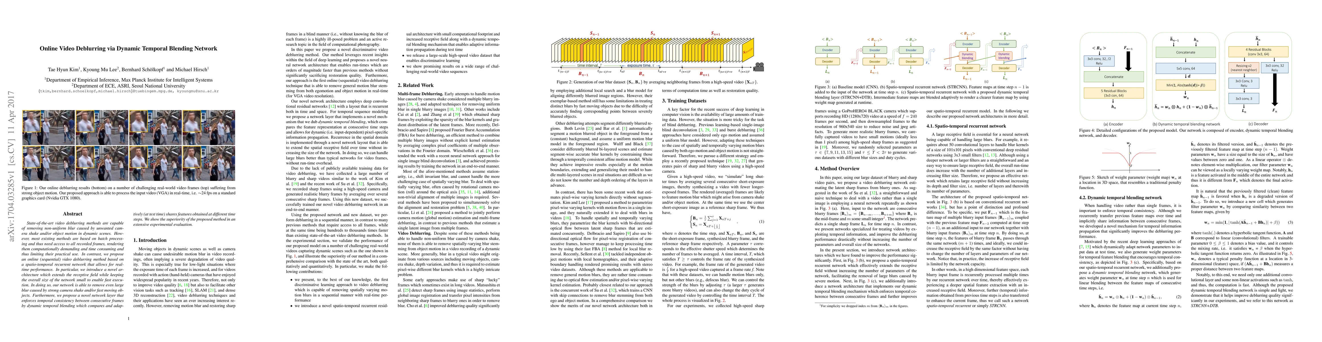The paper proposes an online video deblurring method using a spatio-temporal recurrent network (STRCNN) that extends the receptive field without increasing the network's depth or filter size. A dynamic temporal blending (DTB) layer is introduced to enforce temporal consistency between consecutive frames.