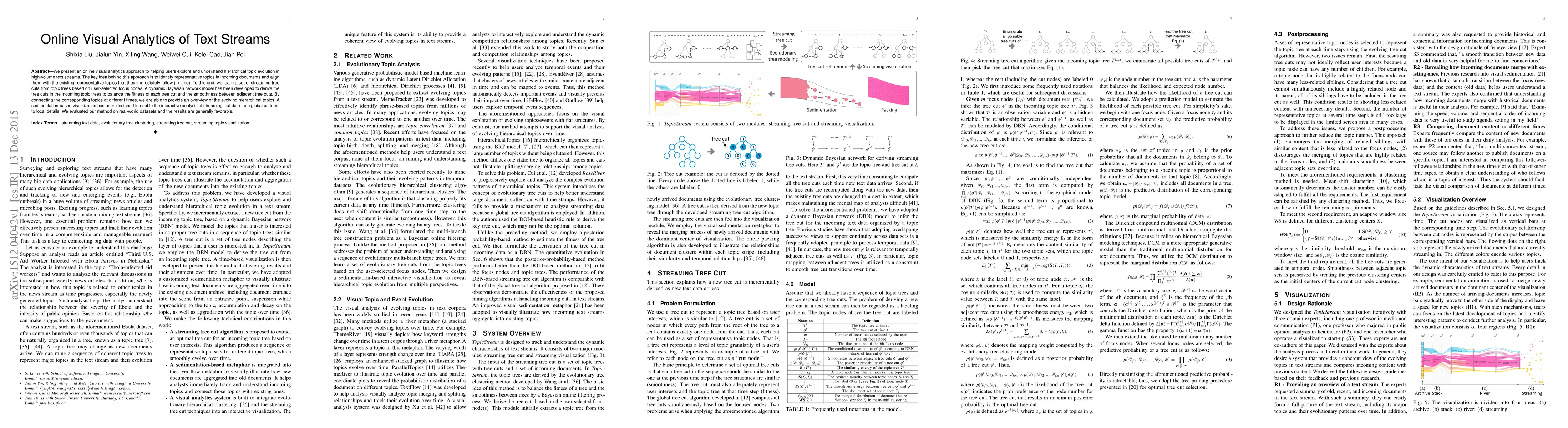 This paper proposes an online visual analytics method for exploring hierarchical topic evolution in high-volume text streams. It uses a dynamic Bayesian network to identify and align representative topics, providing an overview of evolving topics through sedimentation-based visualization. The method was evaluated on real-world datasets with generally favorable results.