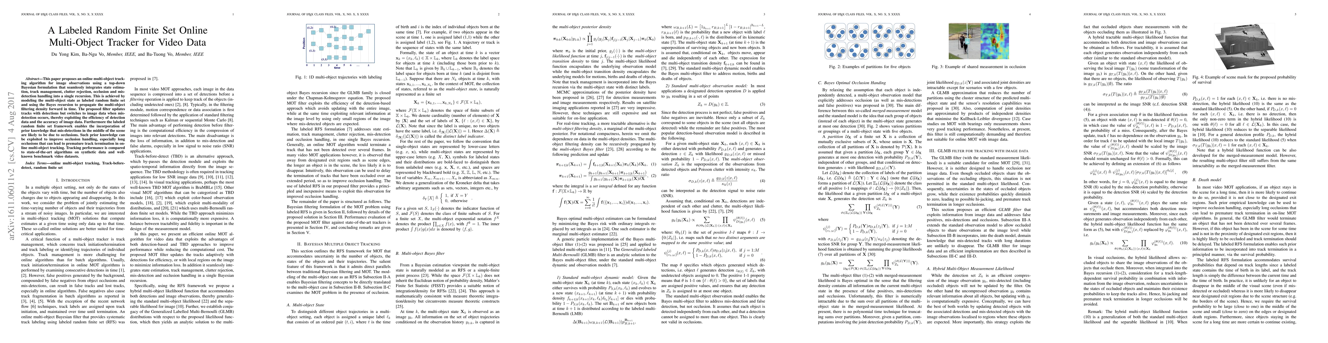 This paper proposes an online visual multi-object tracking algorithm using a top-down Bayesian formulation that integrates state estimation, track management, clutter rejection, occlusion, and mis-detection handling into a single recursion. It models the multi-object state as a labeled random finite set and uses Bayes recursion to propagate the multi-object filtering density forward in time.
