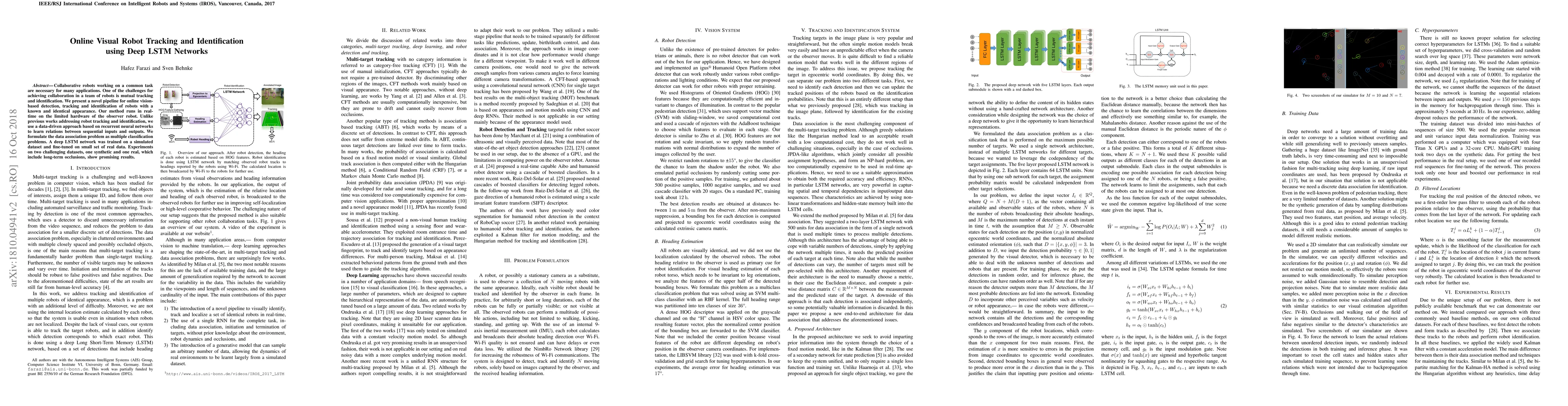 This paper proposes a real-time, data-driven method using deep LSTM networks for online visual tracking and identification of collaborative robots. The approach effectively handles long-term occlusions and achieves promising results on both synthetic and real datasets.