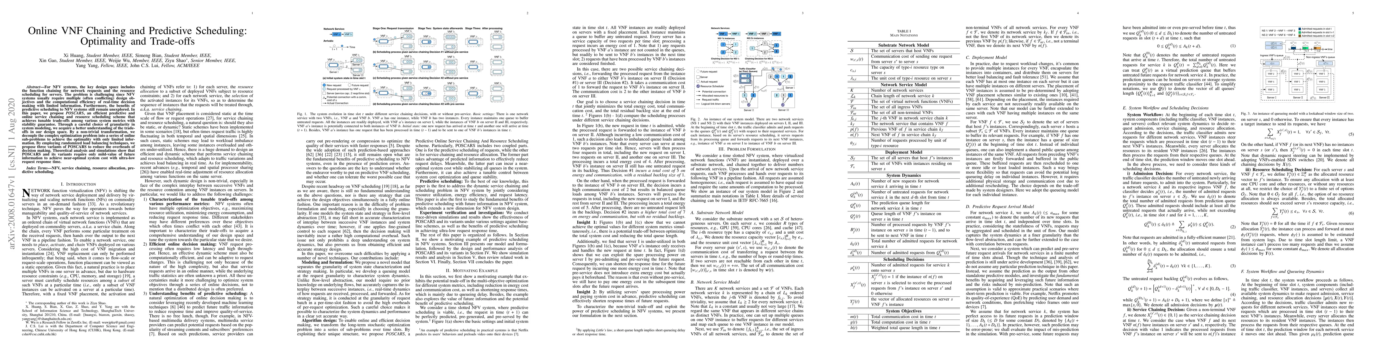 This paper introduces POSCARS, a predictive and online service chaining and resource scheduling scheme for NFV systems, achieving optimal trade-offs among various metrics with queue stability. The authors decouple the complex optimization problem into manageable sub-problems and employ randomized load balancing to reduce decision-making overheads, demonstrating near-optimal system cost with minimal future information.