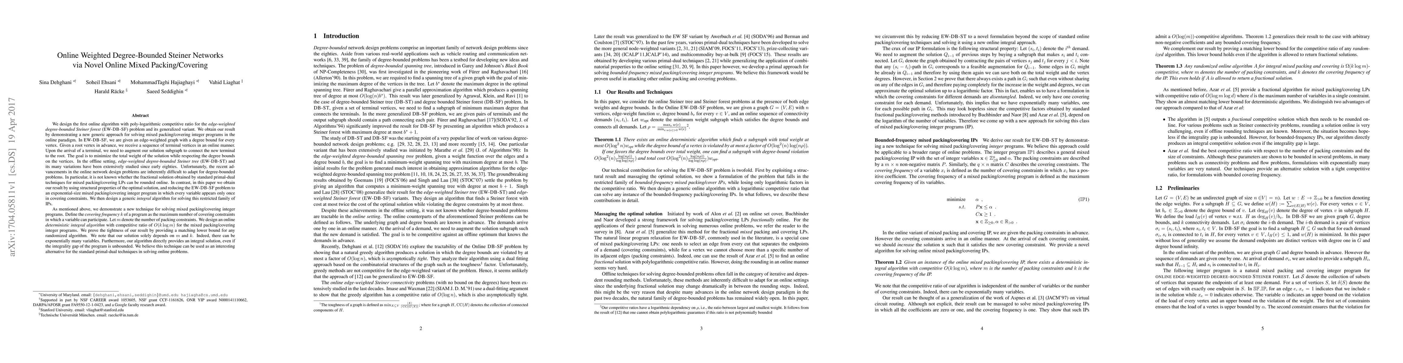 We design the first online algorithm with poly-logarithmic competitive ratio for the edge-weighted degree-bounded Steiner forest(EW-DB-SF) problem and its generalized variant. We obtain our result by demonstrating a new generic approach for solving mixed packing/covering integer programs in the online paradigm. In EW-DB-SF we are given an edge-weighted graph with a degree bound for every vertex. Given a root vertex in advance we receive a sequence of terminal vertices in an online manner. Upon the arrival of a terminal we need to augment our solution subgraph to connect the new terminal to the root. The goal is to minimize the total weight of the solution while respecting the degree bounds on the vertices. In the offline setting edge-weighted degree-bounded Steiner tree (EW-DB-ST) and its many variations have been extensively studied since early eighties. Unfortunately the recent advancements in the online network design problems are inherently difficult to adapt for degree-bounded problems. In contrast in this paper we obtain our result by using structural properties of the optimal solution, and reducing the EW-DB-SF problem to an exponential-size mixed packing/covering integer program in which every variable appears only once in covering constraints. We then design a generic integral algorithm for solving this restricted family of IPs. We demonstrate a new technique for solving mixed packing/covering integer programs. Define the covering frequency k of a program as the maximum number of covering constraints in which a variable can participate. Let m denote the number of packing constraints. We design an online deterministic integral algorithm with competitive ratio of O(k log m) for the mixed packing/covering integer programs. We believe this technique can be used as an interesting alternative for the standard primal-dual techniques in solving online problems.