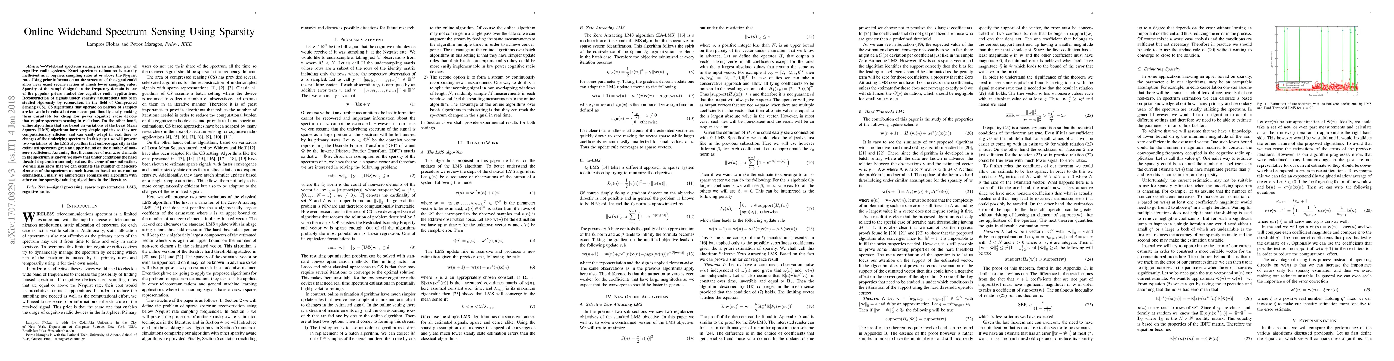 Wideband spectrum sensing is an essential part of cognitive radio systems. Exact spectrum estimation is usually inefficient as it requires sampling rates at or above the Nyquist rate. Using prior information on the structure of the signal could allow near exact reconstruction at much lower sampling rates. Sparsity of the sampled signal in the frequency domain is one of the popular priors studied for cognitive radio applications. Reconstruction of signals under sparsity assumptions has been studied rigorously by researchers in the field of Compressed Sensing (CS). CS algorithms that operate on batches of samples are known to be robust but can be computationally costly, making them unsuitable for cheap low power cognitive radio devices that require spectrum sensing in real time. On the other hand, on line algorithms that are based on variations of the Least Mean Squares (LMS) algorithm have very simple updates so they are computationally efficient and can easily adapt in real time to changes of the underlying spectrum. In this paper we will present two variations of the LMS algorithm that enforce sparsity in the estimated spectrum given an upper bound on the number of non-zero coefficients. Assuming that the number of non-zero elements in the spectrum is known we show that under conditions the hard threshold operation can only reduce the error of our estimation. We will also show that we can estimate the number of non-zero elements of the spectrum at each iteration based on our online estimations. Finally, we numerically compare our algorithm with other on line sparsity-inducing algorithms in the literature.