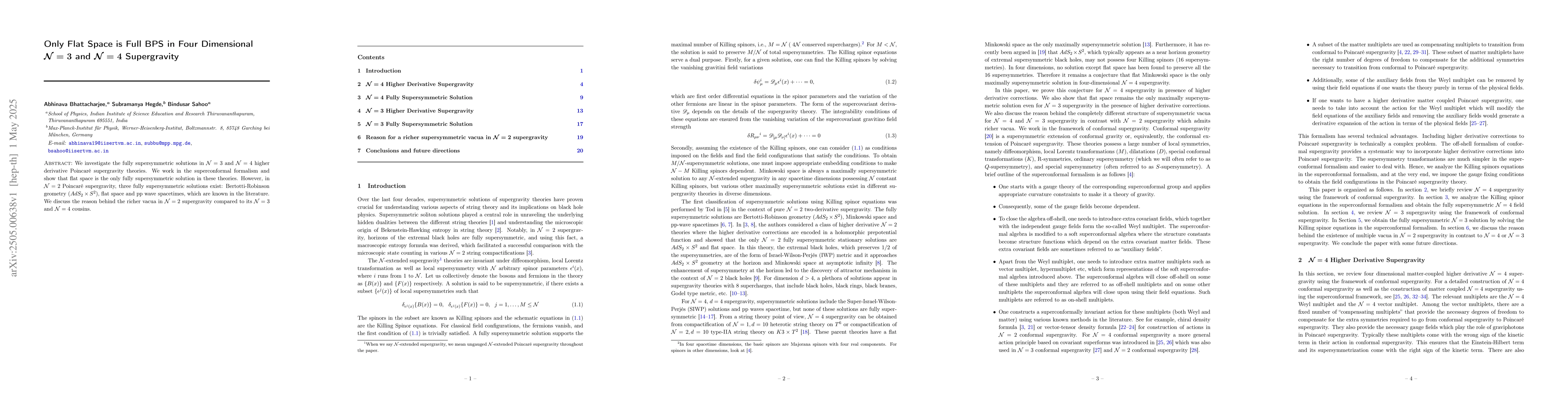 Research finds that only flat space is a fully supersymmetric solution in four-dimensional N=3 and N=4 supergravity theories, contrasting with N=2 supergravity which has three solutions.