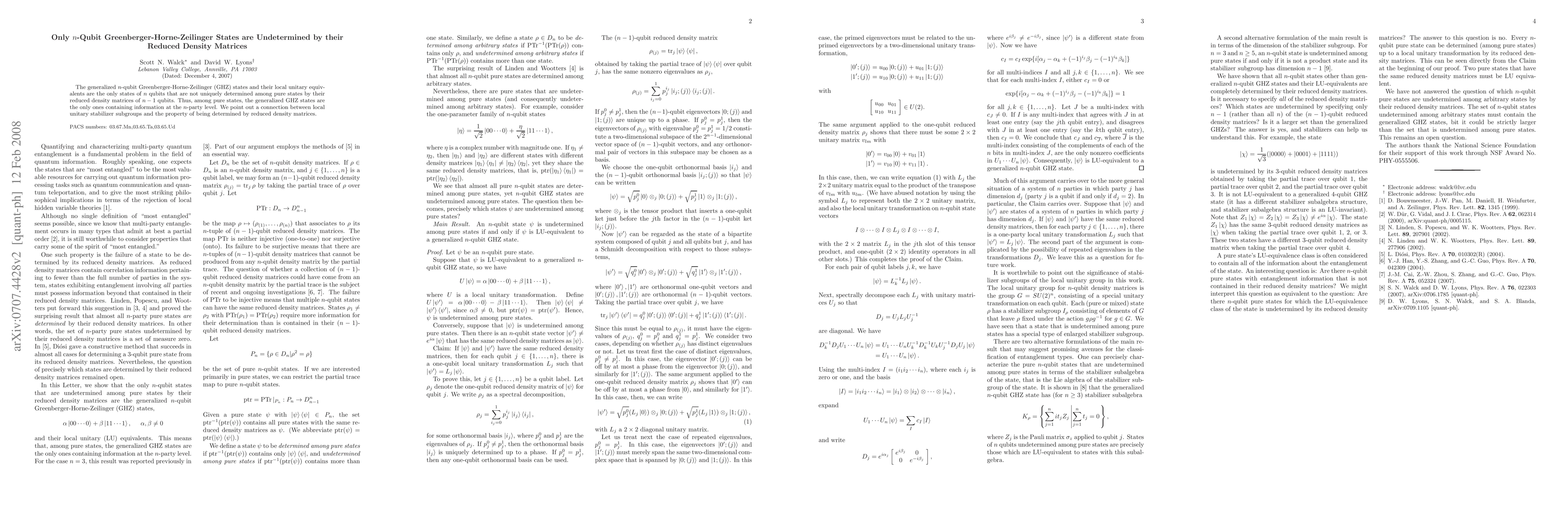 Summary: Generalized n-qubit Greenberger-Horne-Zeilinger (GHZ) states are the only pure states that cannot be uniquely determined by their reduced density matrices, highlighting their unique n-party level information. This property is linked to local unitary stabilizer subgroups.