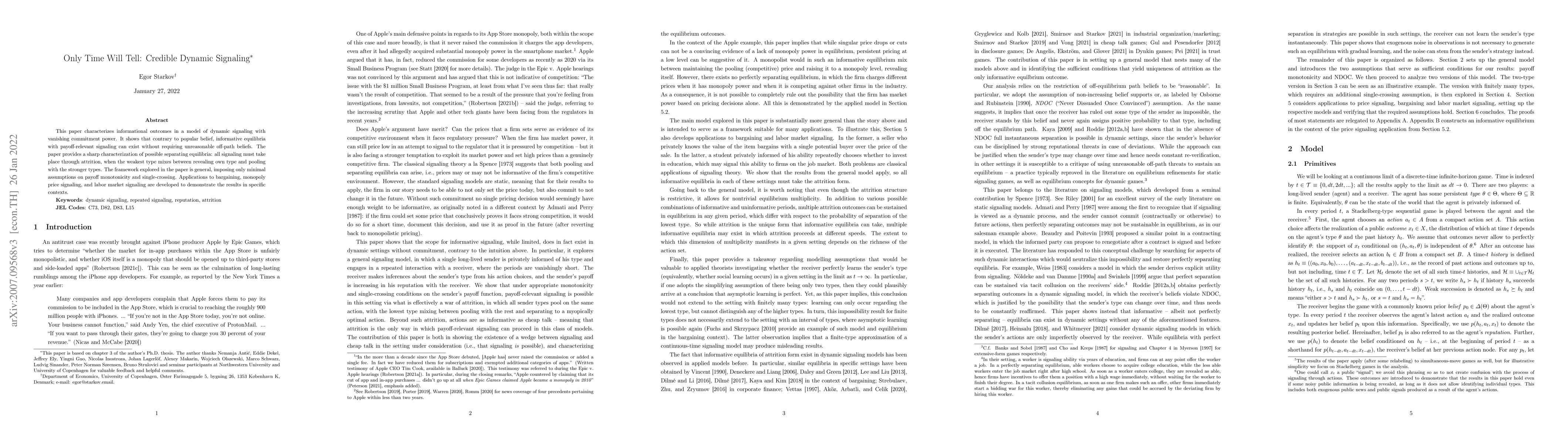 This paper demonstrates that credible dynamic signaling can occur without unreasonable off-path beliefs, relying on attrition for signaling where weaker types mix revealing their type with pooling. It applies this framework to contexts like bargaining, monopoly pricing, and labor markets.