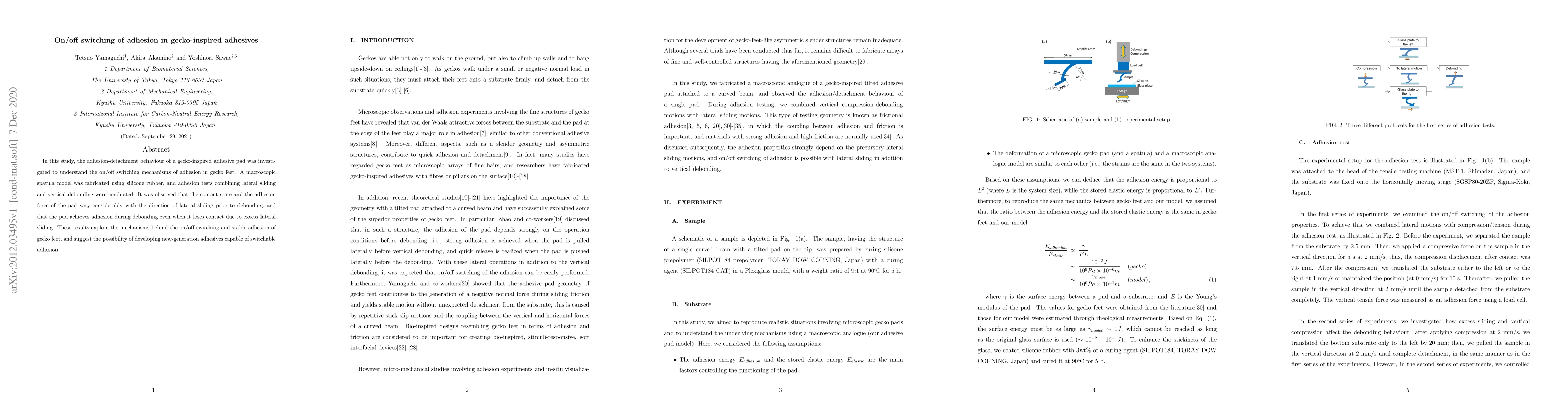 A macroscopic spatula model made of silicone rubber was fabricated to investigate the adhesion-detachment behavior of a gecko-inspired adhesive pad. Adhesion tests combining lateral sliding and vertical debonding were conducted to understand the on/off switching mechanisms of adhesion in gecko feet.