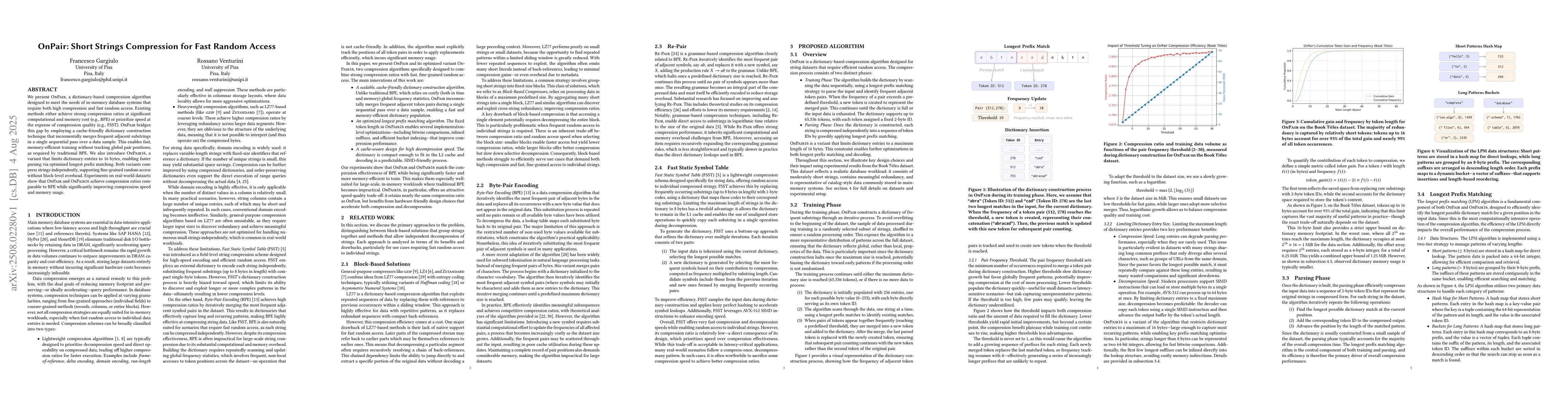 We present OnPair, a dictionary-based compression algorithm designed to meet the needs of in-memory database systems that require both high compression and fast random access. Existing methods either achieve strong compression ratios at significant computational and memory cost (e.g., BPE) or prioritize speed at the expense of compression quality (e.g., FSST). OnPair bridges this gap by employing a cache-friendly dictionary construction technique that incrementally merges frequent adjacent substrings in a single sequential pass over a data sample. This enables fast, memory-efficient training without tracking global pair positions, as required by traditional BPE. We also introduce OnPair16, a variant that limits dictionary entries to 16 bytes, enabling faster parsing via optimized longest prefix matching. Both variants compress strings independently, supporting fine-grained random access without block-level overhead. Experiments on real-world datasets show that OnPair and OnPair16 achieve compression ratios comparable to BPE while significantly improving compression speed and memory usage.