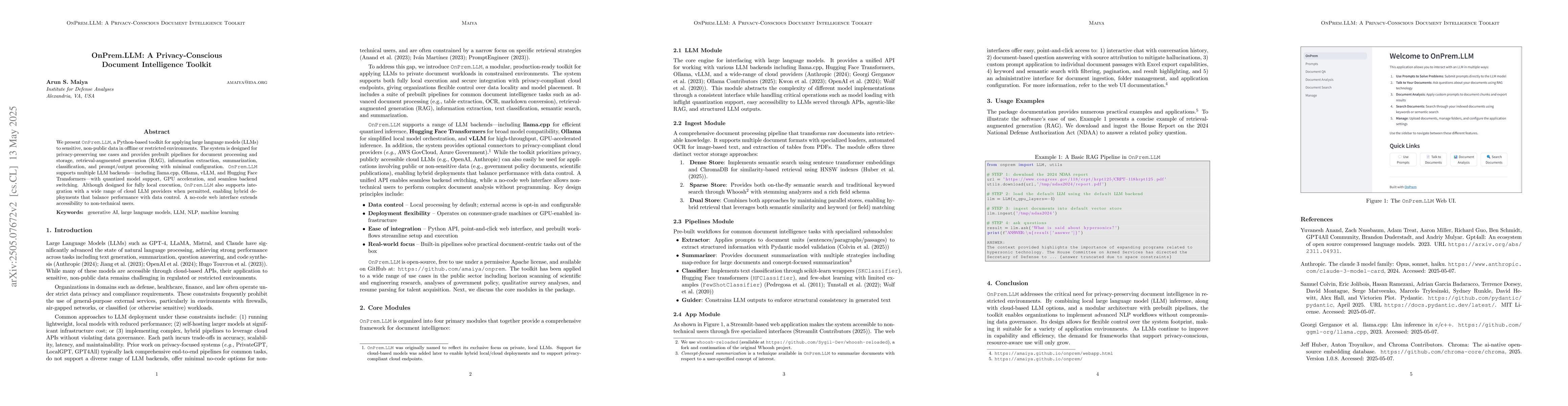 The novelty of OnPrem.LLM lies in its comprehensive approach to privacy-preserving document intelligence tasks, offering a flexible toolkit with support for various LLM backends and a user-friendly web interface.