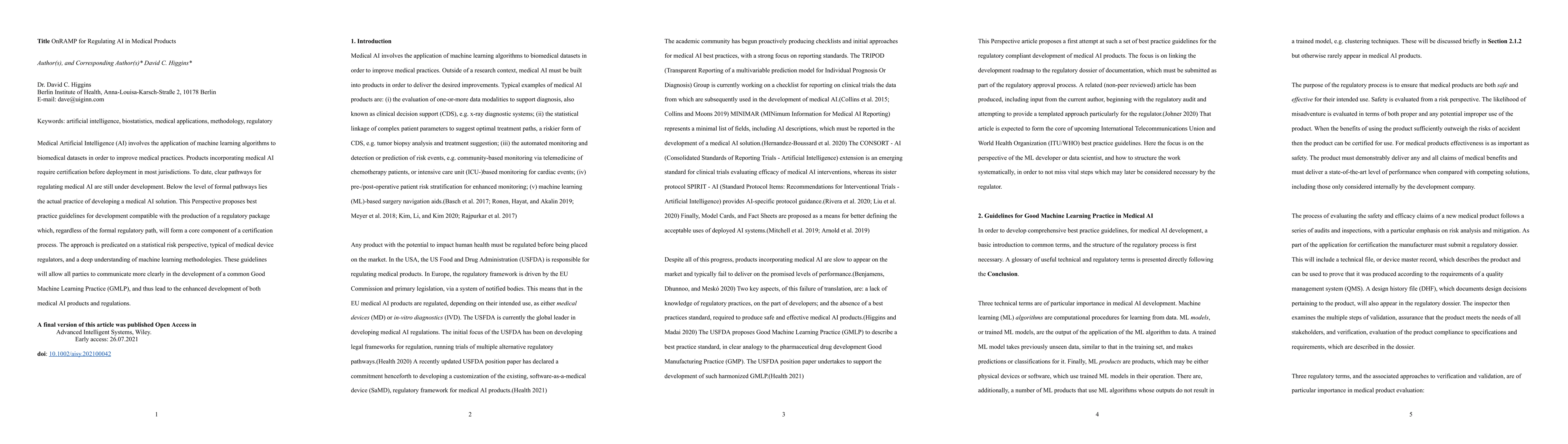 Medical Artificial Intelligence (AI) involves the application of machine learning algorithms to biomedical datasets in order to improve medical practices. Products incorporating medical AI require certification before deployment in most jurisdictions. To date, clear pathways for regulating medical AI are still under development. Below the level of formal pathways lies the actual practice of developing a medical AI solution. This Perspective proposes best practice guidelines for development compatible with the production of a regulatory package which, regardless of the formal regulatory path, will form a core component of a certification process. The approach is predicated on a statistical risk perspective, typical of medical device regulators, and a deep understanding of machine learning methodologies. These guidelines will allow all parties to communicate more clearly in the development of a common Good Machine Learning Practice (GMLP), and thus lead to the enhanced development of both medical AI products and regulations.