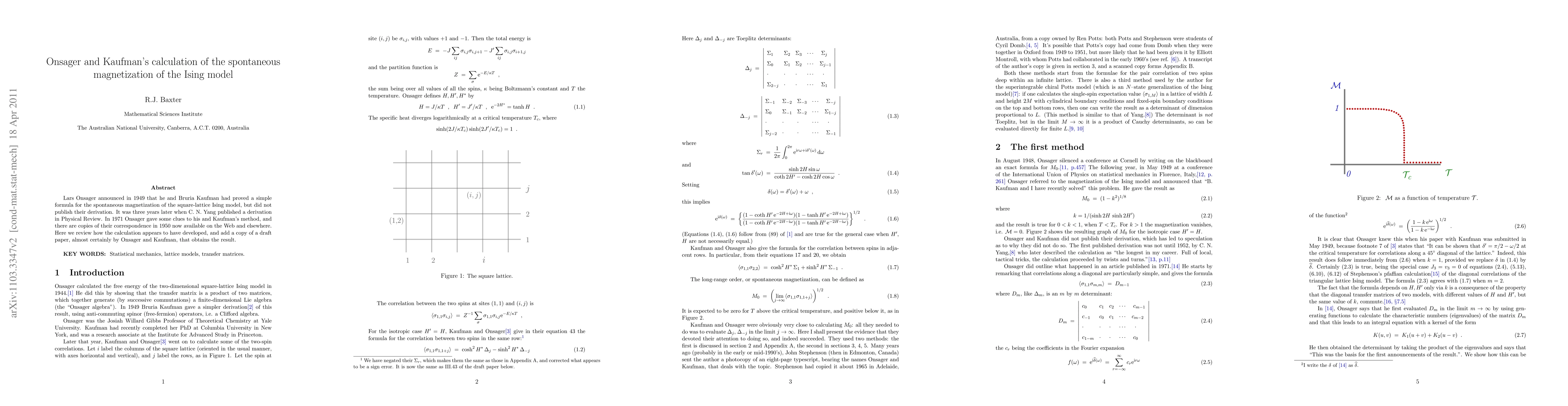 In 1949, Lars Onsager and Bruria Kaufman derived a formula for the spontaneous magnetization of the square-lattice Ising model, later published via Yang's derivation in 1950 and Onsager's 1971 clues. A draft paper by Onsager and Kaufman, now available, provides insight into their method.