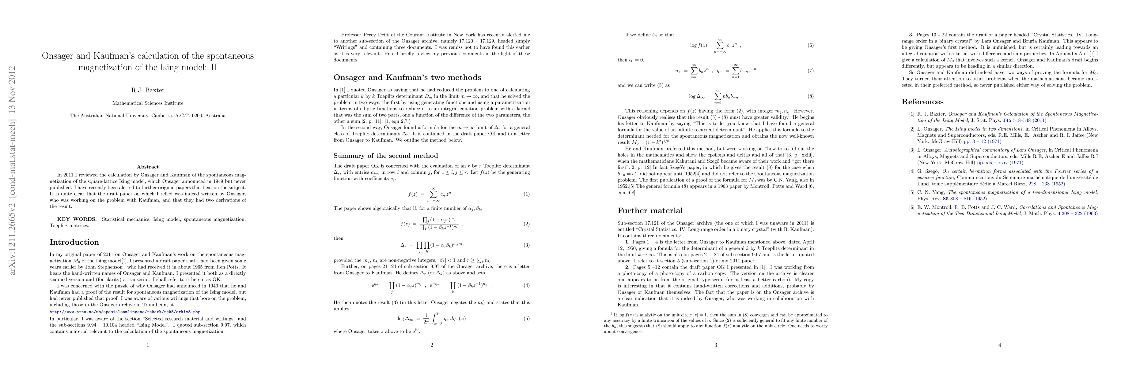 The paper elucidates Onsager and Kaufman's two distinct methods for calculating the spontaneous magnetization of the Ising model, providing a deeper understanding of Toeplitz determinants and generating functions in statistical mechanics.