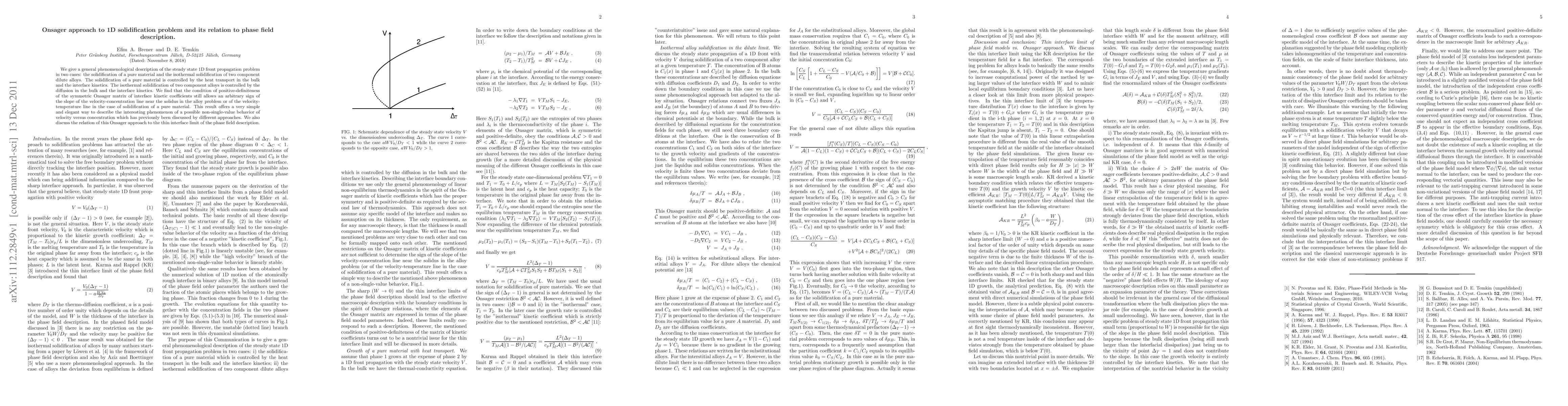This paper presents a phenomenological description of 1D solidification front propagation in pure materials and dilute alloys, highlighting the role of heat and diffusion transport. It demonstrates that Onsager's matrix condition allows for non-single-value behavior in velocity versus concentration, linking this approach to the phase field model's thin interface limit.