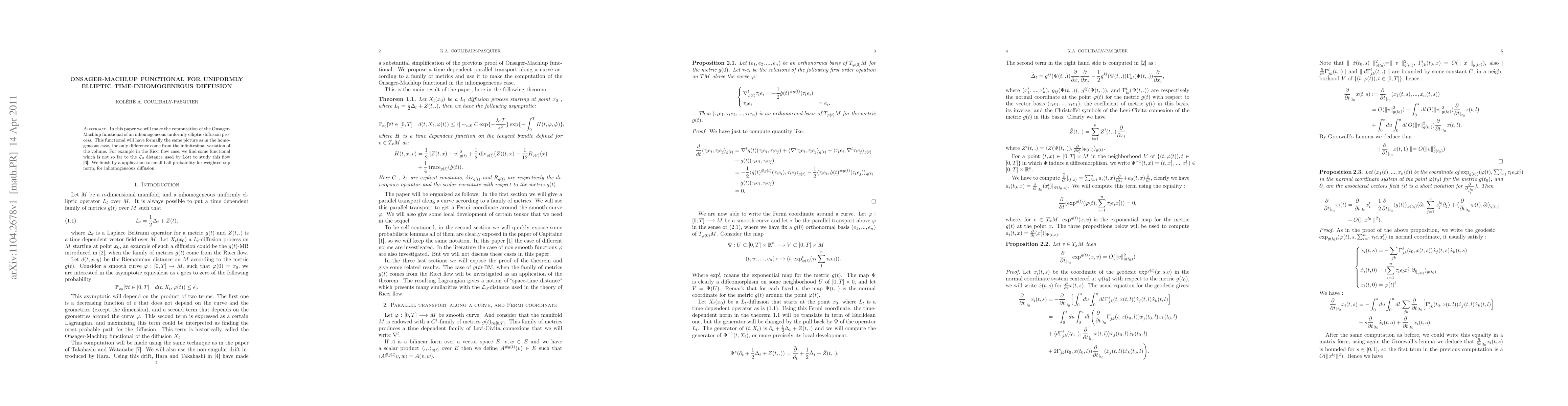 In this paper we will make the computation of the Onsager-Machlup functional of an inhomogeneous uniformly elliptic diffusion process. This functional will have formally the same picture as in the homogeneous case, the only difference come from the infinitesimal variation of the volume. For example in the Ricci flow case, we find some functional which is not so far to the $\mathcal L_{0} $ distance used by Lott to study this flow \cite{Lott:08}. We finish by a application to small ball probability for weighted sup norm, for inhomogeneous diffusion.