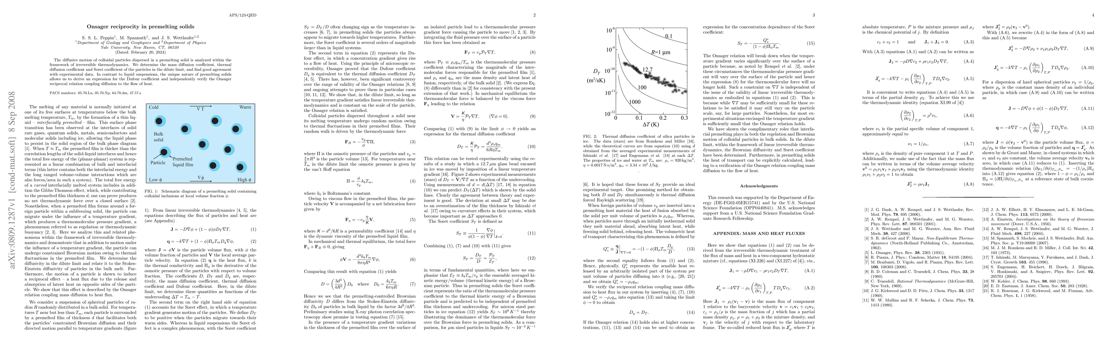 The diffusive motion of colloidal particles dispersed in a premelting solid is analyzed within the framework of irreversible thermodynamics. We determine the mass diffusion coefficient, thermal diffusion coefficient and Soret coefficient of the particles in the dilute limit, and find good agreement with experimental data. In contrast to liquid suspensions, the unique nature of premelting solids allows us to derive an expression for the Dufour coefficient and independently verify the Onsager reciprocal relation coupling diffusion to the flow of heat.