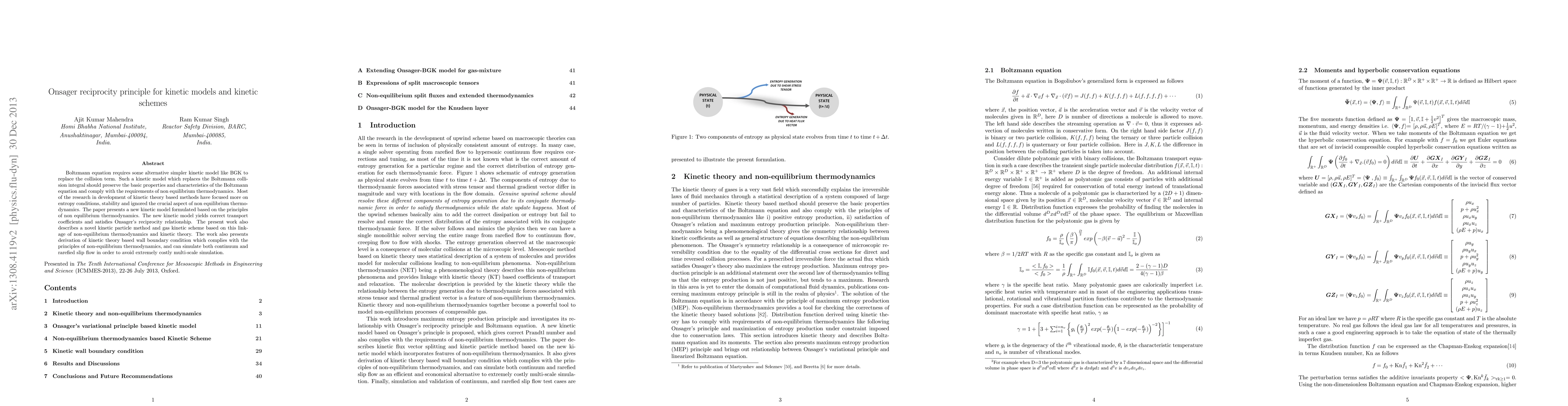 Boltzmann equation requires some alternative simpler kinetic model like BGK to replace the collision term. Such a kinetic model which replaces the Boltzmann collision integral should preserve the basic properties and characteristics of the Boltzmann equation and comply with the requirements of non equilibrium thermodynamics. Most of the research in development of kinetic theory based methods have focused more on entropy conditions, stability and ignored the crucial aspect of non equilibrium thermodynamics. The paper presents a new kinetic model formulated based on the principles of non equilibrium thermodynamics. The new kinetic model yields correct transport coefficients and satisfies Onsager's reciprocity relationship. The present work also describes a novel kinetic particle method and gas kinetic scheme based on this linkage of non-equilibrium thermodynamics and kinetic theory. The work also presents derivation of kinetic theory based wall boundary condition which complies with the principles of non-equilibrium thermodynamics, and can simulate both continuum and rarefied slip flow in order to avoid extremely costly multi-scale simulation.