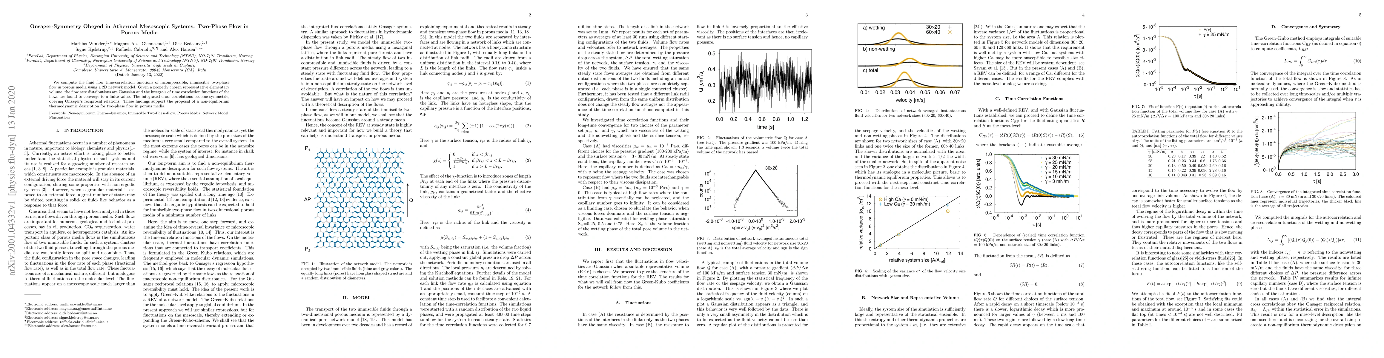 This study uses a 2D network model to analyze the fluid flow time-correlation functions in athermal mesoscopic systems, demonstrating that integrated cross-correlations obey Onsager's reciprocal relations, supporting a non-equilibrium thermodynamic framework for two-phase flow in porous media.