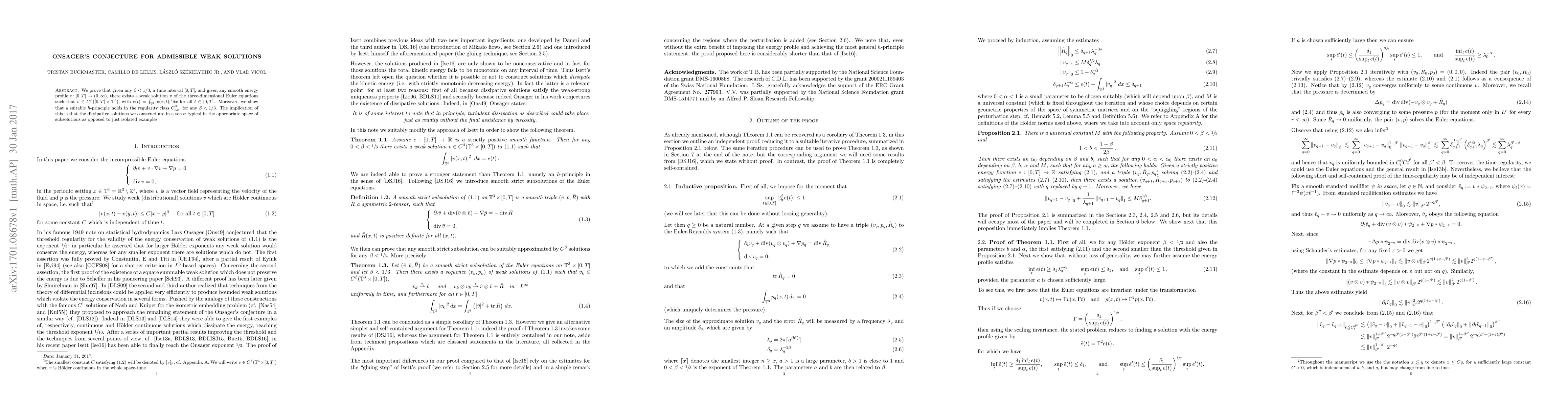 The paper introduces a novel approach to proving Onsager's conjecture by constructing weak solutions with controlled regularity and demonstrating a suitable $h$-principle for these solutions.