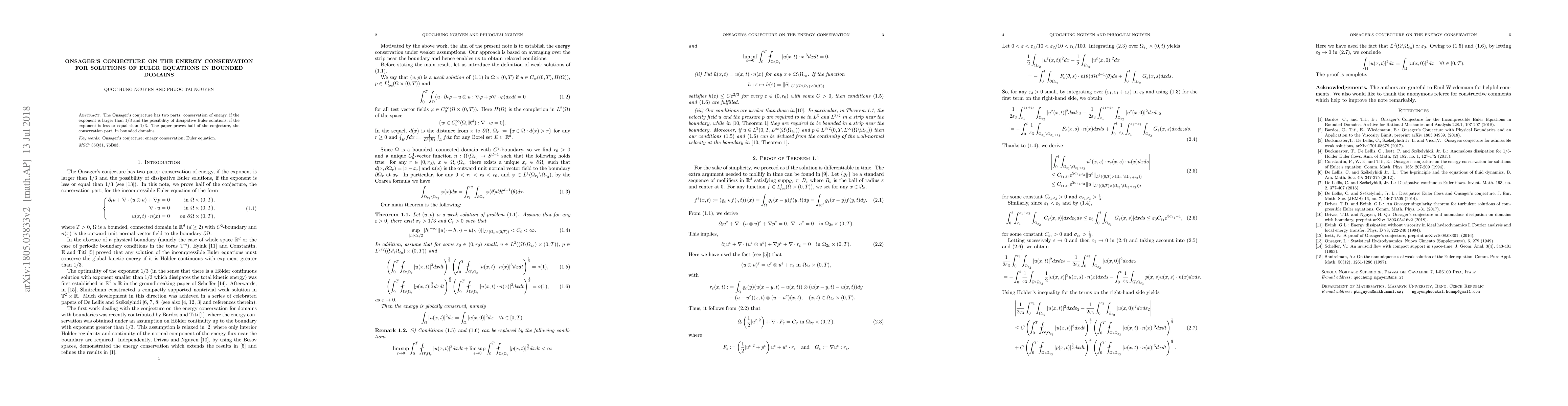 Summary: This paper proves the energy conservation aspect of Onsager's conjecture for Euler equations in bounded domains when the exponent exceeds $1/3$, while the dissipative solution part remains unresolved.