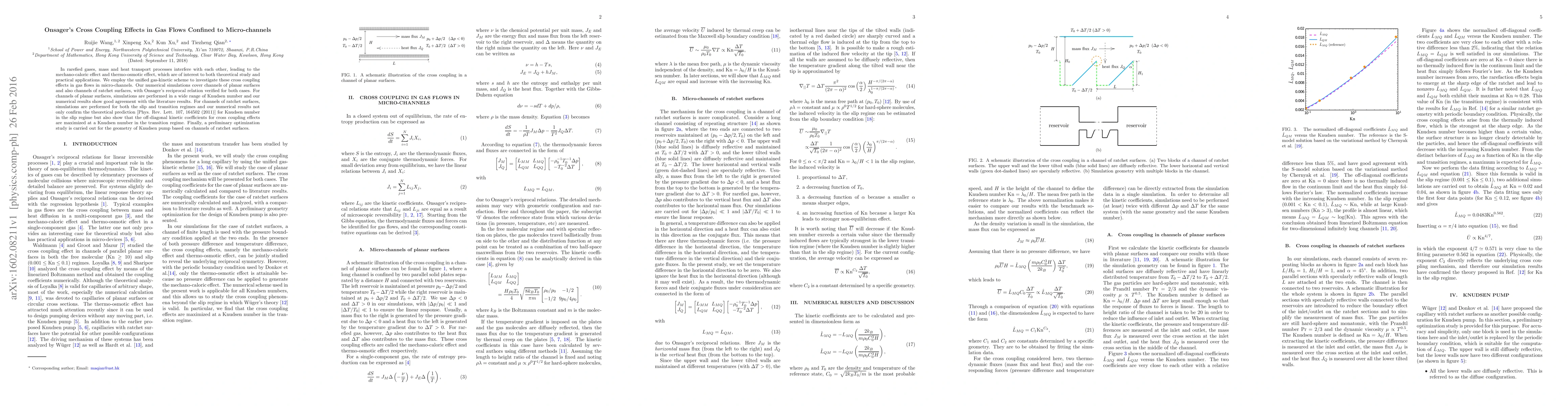 In rarefied gases, mass and heat transport processes interfere with each other, leading to the mechano-caloric effect and thermo-osmotic effect, which are of interest to both theoretical study and practical applications. We employ the unified gas-kinetic scheme to investigate these cross coupling effects in gas flows in micro-channels. Our numerical simulations cover channels of planar surfaces and also channels of ratchet surfaces, with Onsager's reciprocal relation verified for both cases. For channels of planar surfaces, simulations are performed in a wide range of Knudsen number and our numerical results show good agreement with the literature results. For channels of ratchet surfaces, simulations are performed for both the slip and transition regimes and our numerical results not only confirm the theoretical prediction [Phys. Rev. Lett. 107, 164502 (2011)] for Knudsen number in the slip regime but also show that the off-diagonal kinetic coefficients for cross coupling effects are maximized at a Knudsen number in the transition regime. Finally, a preliminary optimization study is carried out for the geometry of Knudsen pump based on channels of ratchet surfaces.