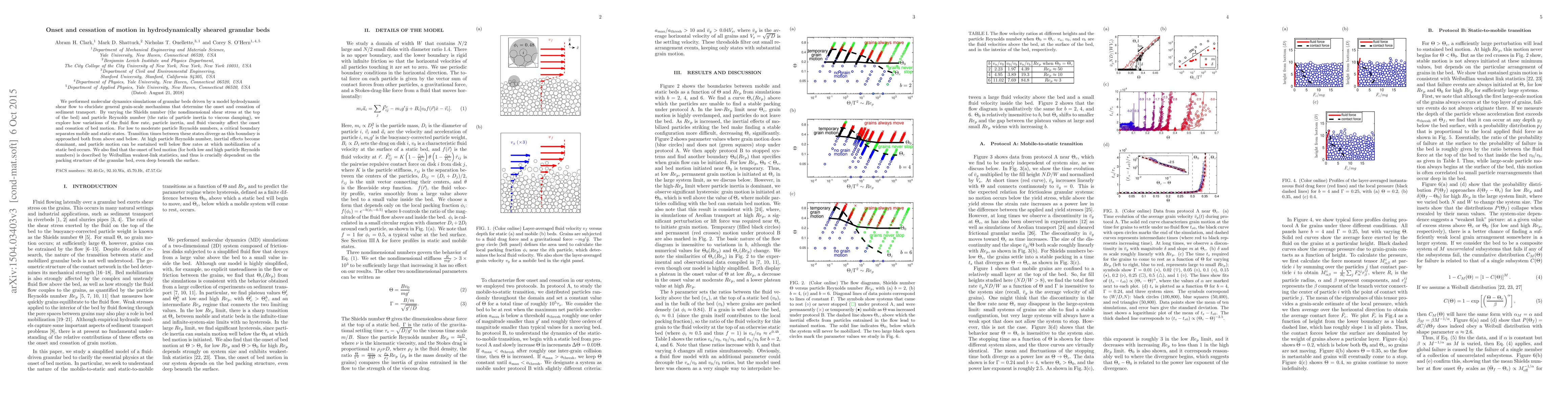 This paper uses molecular dynamics simulations to investigate how hydrodynamic shear flow affects granular beds, focusing on the onset and cessation of sediment transport. The study reveals that critical boundaries exist for transitions between mobile and static states, with transition times diverging near these boundaries, and that the onset of bed motion follows Weibullian weakest-link statistics, highlighting the importance of granular bed packing structure.