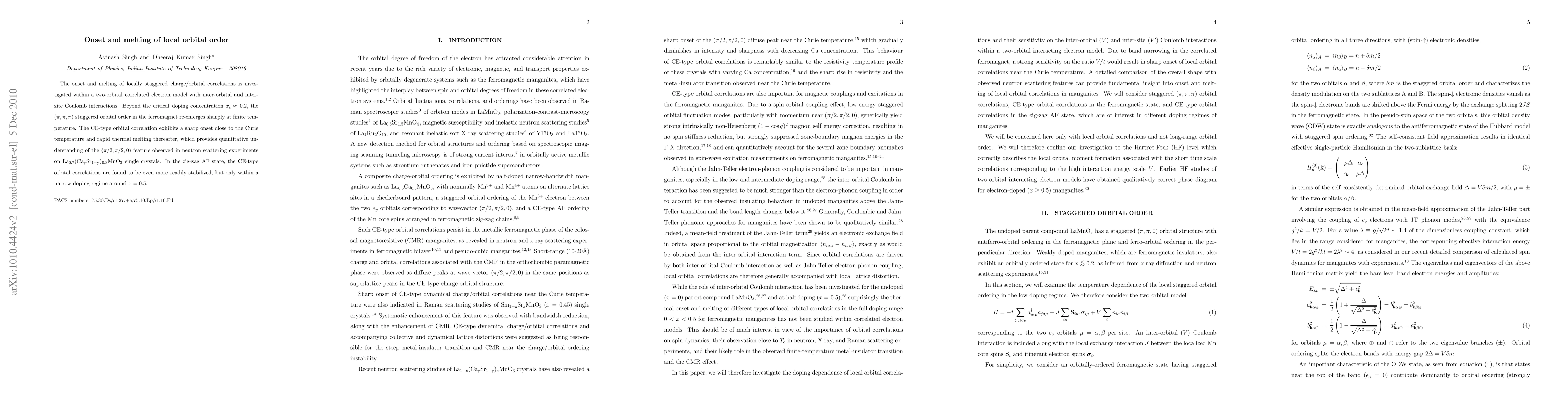 Researchers investigate orbital order in a two-orbital model, finding that staggered correlations stabilize at finite temperatures beyond a critical doping concentration, and exhibit rapid thermal melting near the Curie temperature.