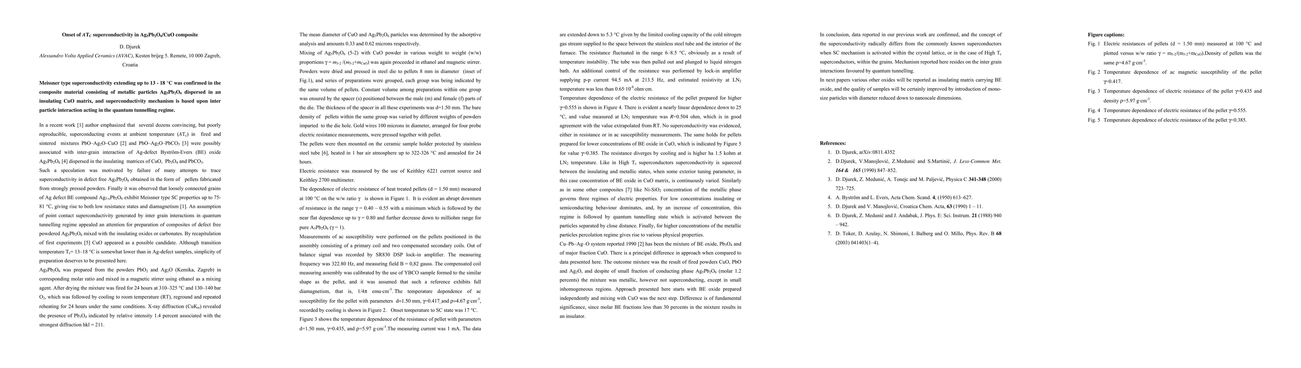 Meissner type superconductivity extending up to 13 - 18 degrees Celsius was confirmed in the composite material consisting of metallic particles Ag5Pb2O6 dispersed in an insulating CuO matrix, and superconductivity mechanism is based upon inter particle interaction acting in the quantum tunnelling regime.