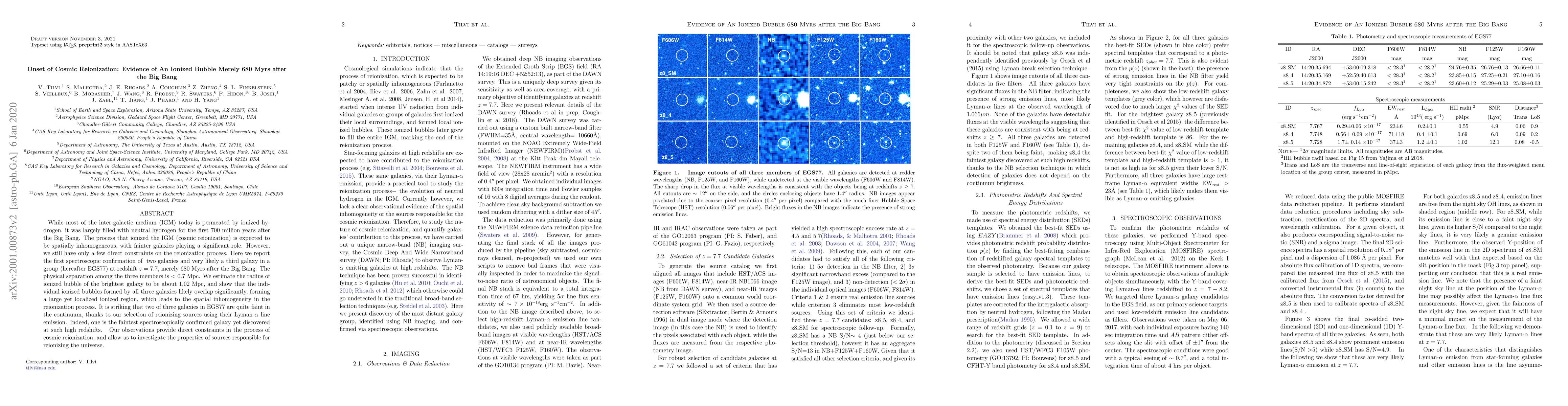While most of the inter-galactic medium (IGM) today is permeated by ionized hydrogen, it was largely filled with neutral hydrogen for the first 700 million years after the Big Bang. The process that ionized the IGM (cosmic reionization) is expected to be spatially inhomogeneous, with fainter galaxies playing a significant role. However, we still have only a few direct constraints on the reionization process. Here we report the first spectroscopic confirmation of two galaxies and very likely a third galaxy in a group (hereafter EGS77) at redshift z = 7.7, merely 680 Myrs after the Big Bang. The physical separation among the three members is < 0.7 Mpc. We estimate the radius of ionized bubble of the brightest galaxy to be about 1.02 Mpc, and show that the individual ionized bubbles formed by all three galaxies likely overlap significantly, forming a large yet localized ionized region, which leads to the spatial inhomogeneity in the reionization process. It is striking that two of three galaxies in EGS77 are quite faint in the continuum, thanks to our selection of reionizing sources using their Lyman-alpha line emission. Indeed, one is the faintest spectroscopically confirmed galaxy yet discovered at such high redshifts. Our observations provide direct constraints in the process of cosmic reionization, and allow us to investigate the properties of sources responsible for reionizing the universe.