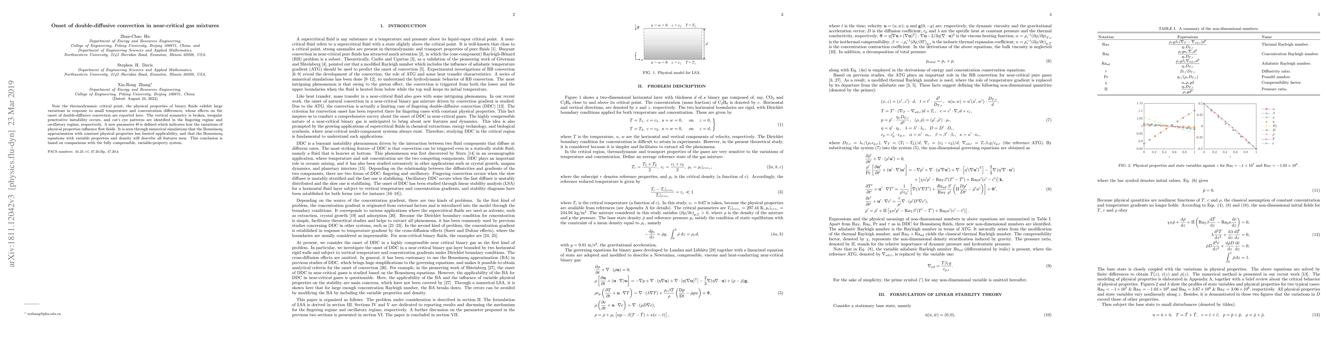 This paper investigates the onset of double-diffusive convection in near-critical gas mixtures, revealing irregular patterns and cat's eye formations due to significant property variations. The study introduces a new parameter {\Theta} to quantify these variations' impact on flow fields, demonstrating that the Boussinesq approximation with constant properties is insufficient, and variable-property models are necessary for accurate descriptions.