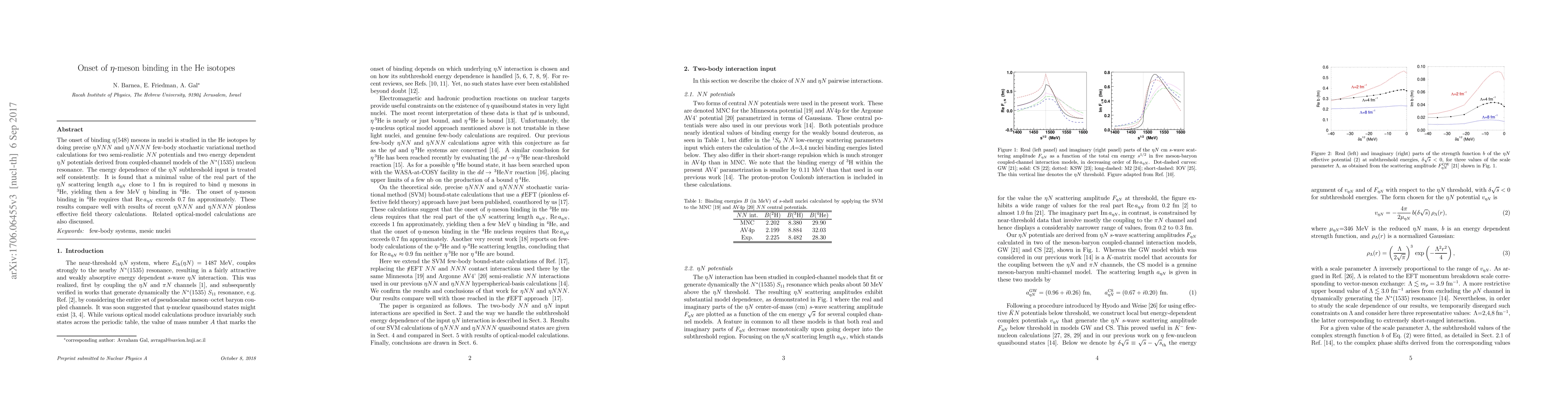 The onset of binding $\eta$(548) mesons in nuclei is studied in the He isotopes by doing precise $\eta NNN$ and $\eta NNNN$ few-body stochastic variational method calculations for two semi-realistic $NN$ potentials and two energy dependent $\eta N$ potentials derived from coupled-channel models of the $N^{\ast}(1535)$ nucleon resonance. The energy dependence of the $\eta N$ subthreshold input is treated self consistently. It is found that a minimal value of the real part of the $\eta N$ scattering length $a_{\eta N}$ close to 1 fm is required to bind $\eta$ mesons in $^3$He, yielding then a few MeV $\eta$ binding in $^4$He. The onset of $\eta$-meson binding in $^4$He requires that Re$\,a_{\eta N}$ exceeds 0.7 fm approximately. These results compare well with results of recent $\eta NNN$ and $\eta NNNN$ pionless effective field theory calculations. Related optical-model calculations are also discussed.