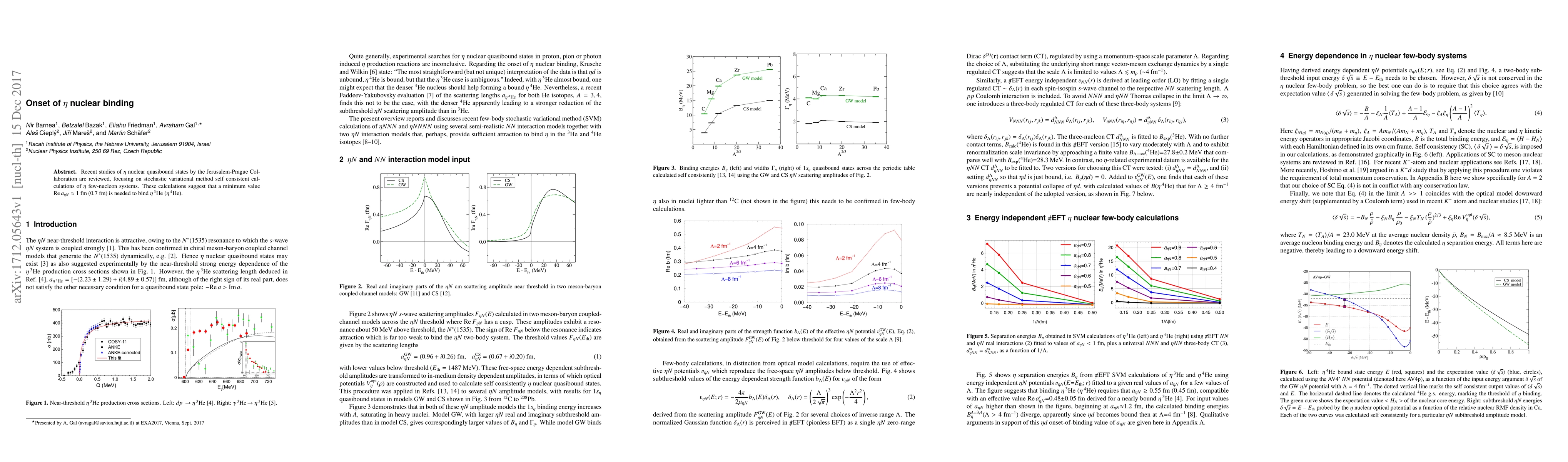 Recent studies of $\eta$ nuclear quasibound states by the Jerusalem-Prague Collaboration are reviewed, focusing on stochastic variational method self consistent calculations of $\eta$ few-nucleon systems. These calculations suggest that a minimum value Re$\,a_{\eta N} \approx 1$ fm (0.7 fm) is needed to bind $\eta\,^3$He ($\eta\,^4$He).