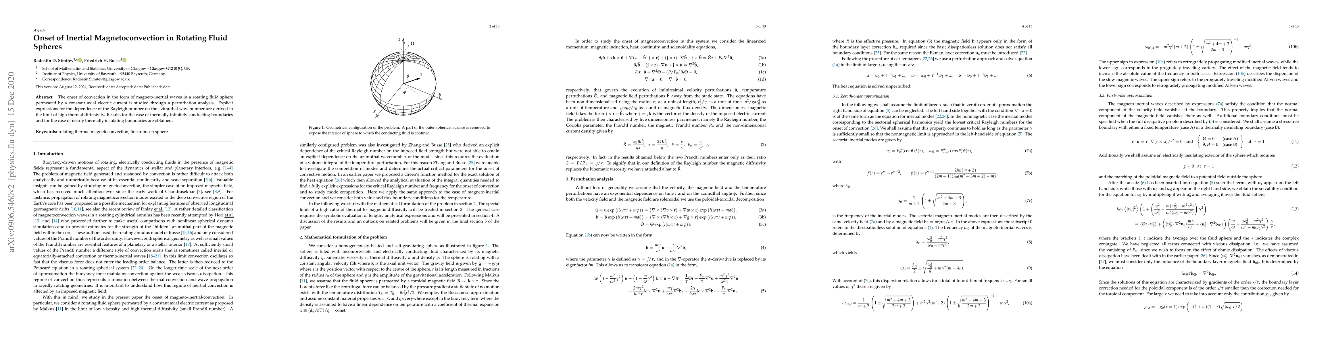 Researchers studied how a rotating fluid sphere with a constant electric current develops convection patterns, discovering explicit expressions for the conditions under which these patterns emerge.